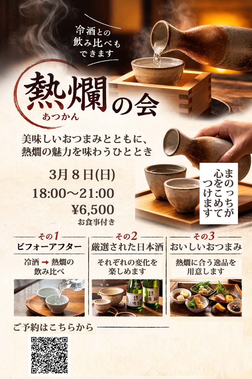 熱燗とひやの飲み比べ日本酒会(熱燗に合う食べ物付き)