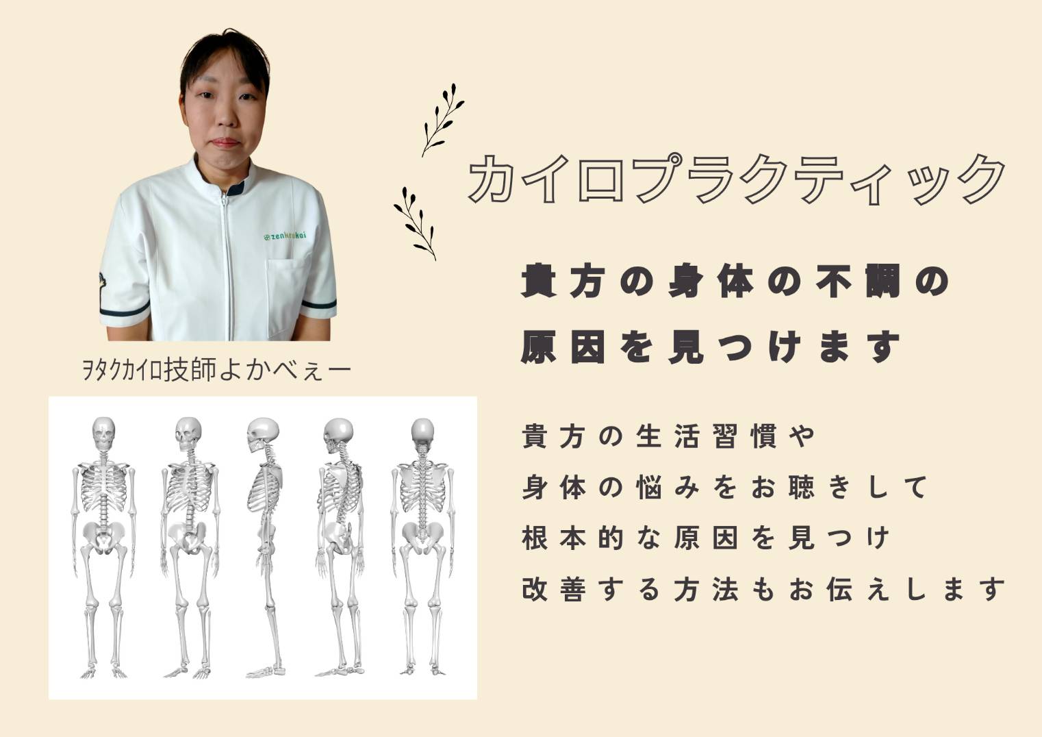 カイロプラクティックとは 骨盤や背骨の歪みを徒手によって調整し、お客様の生活習慣もお聞きし、生活習慣改善のお手伝いもさせていただきます。