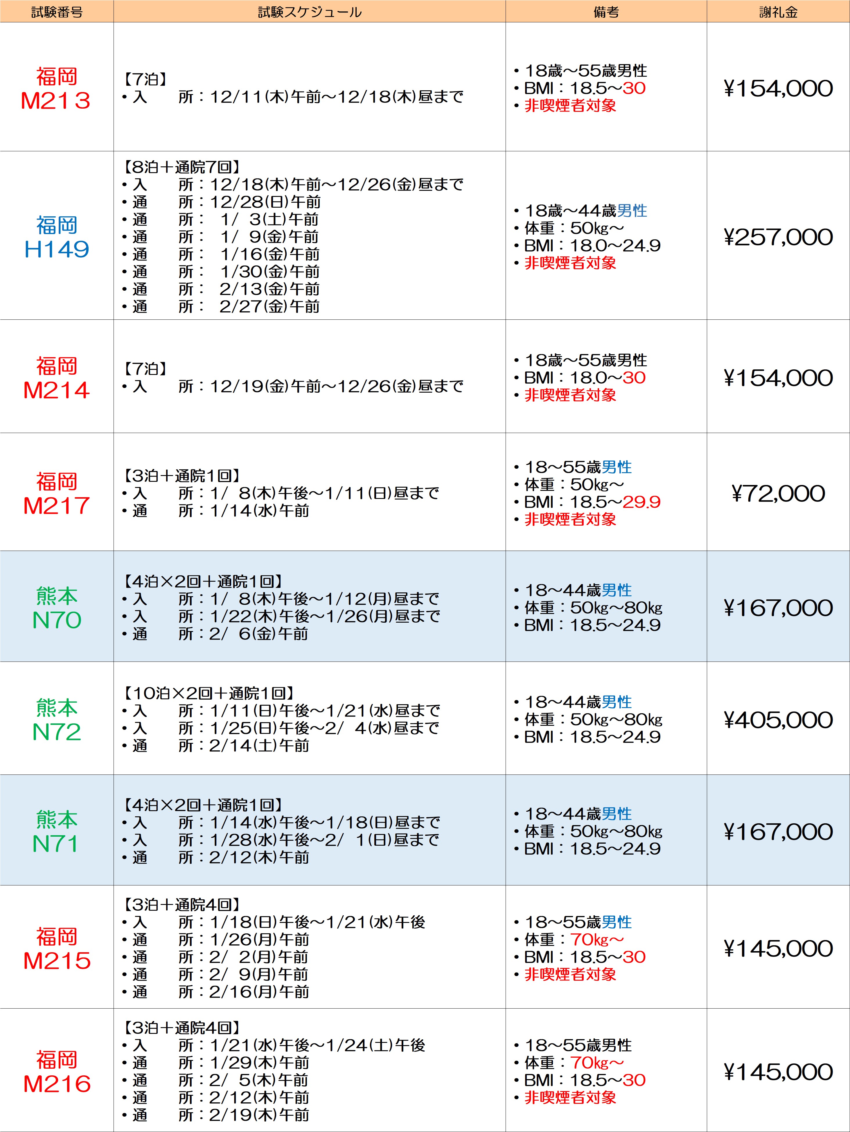 医薬品の開発に欠かせない治験(臨床試験)に協力いただける方に1泊あたり16,000~20,000円及び1通院あたり10,000~15,000円の負担軽減費(謝礼金)のお支払い(実施医療機関よりお振込)