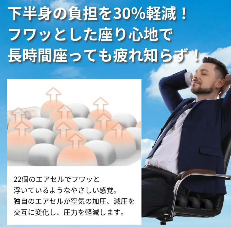 特許取得の独自エアセルで体圧を約30%軽減し、長時間座っていてもお尻の負担、蒸れを軽減。4辺にファスナーを付属させ、自由につなぎ合わせることができます。長い椅子やソファーにも使用可能美容室などにも使われています。