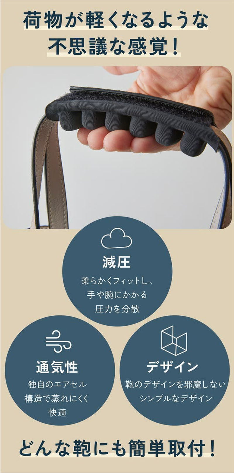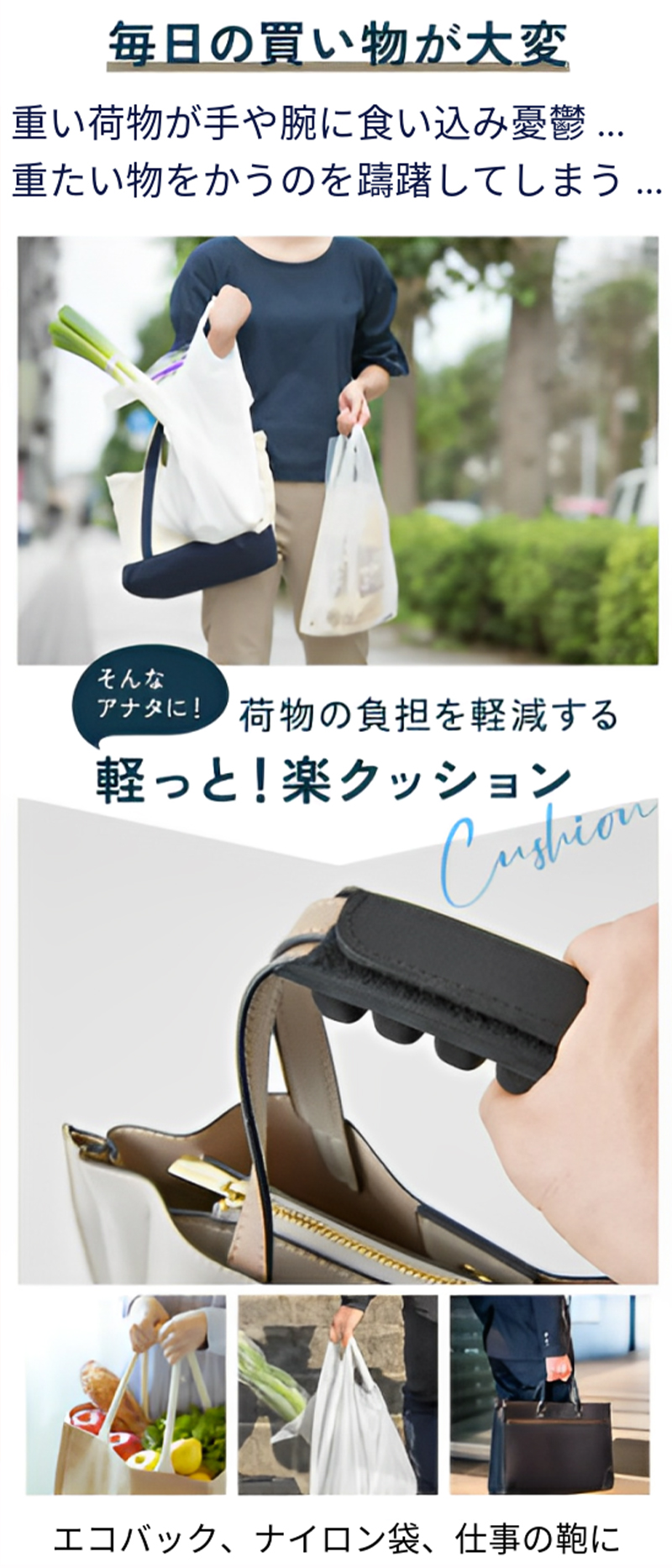 今までにありそうでなかつたエコバックやリュックの持ち手に使用可能買い物時の重い荷物、お持ちのエコバックに付けて頂くだけで、指や腕の負担を大幅に軽減犬のリードなどにもおすすめ日頃の買い物をより快適にしてくれるアイテムです。