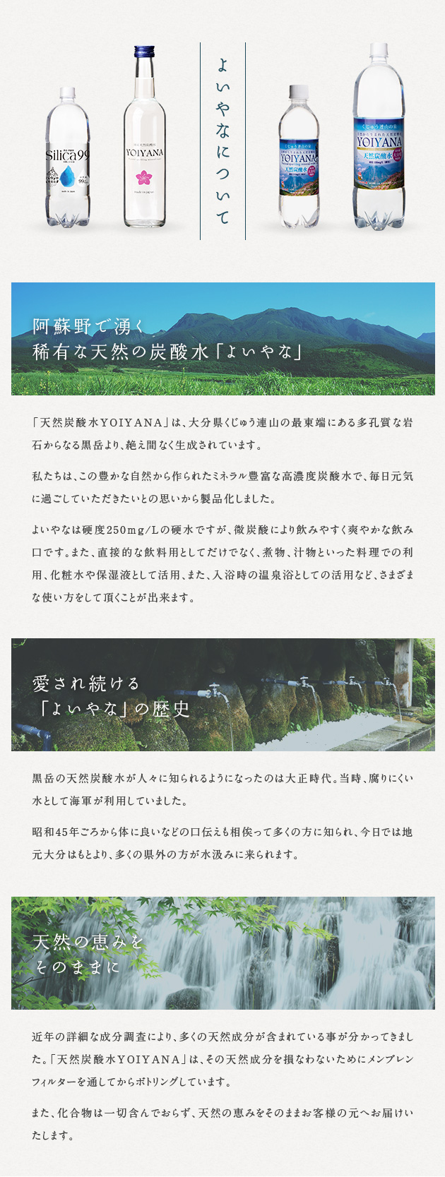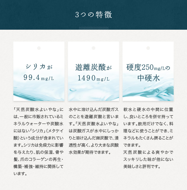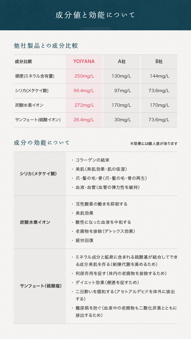| 栄養成分 | 100ml(当たり)/エネルギー 0kcal/タンパク質 0g/脂質 0g/炭水化物 0g/食塩相当量 0g/カルシウム7.3mg/マグネシウム1.8mg/カリウム0.4mg |