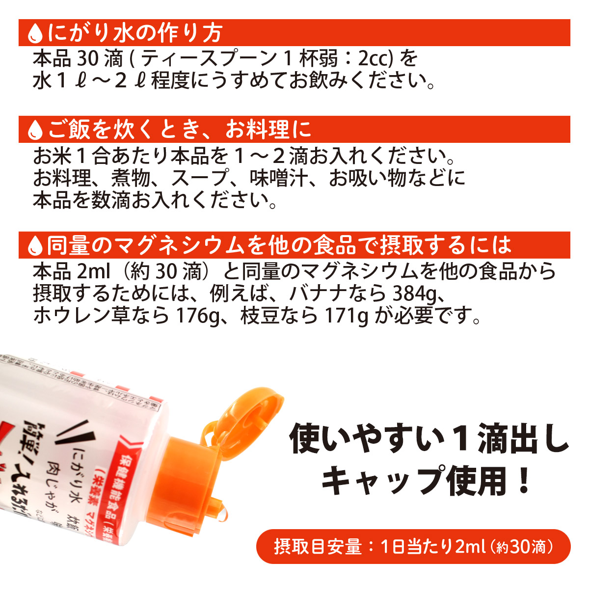 | 栄養成分 | 100ml(当たり)/エネルギー 0kcal/タンパク質 0g/脂質 0g/炭水化物 0g/食塩相当量 11.2g/マグネシウム 6,152mg/カリウム 1,718mg |