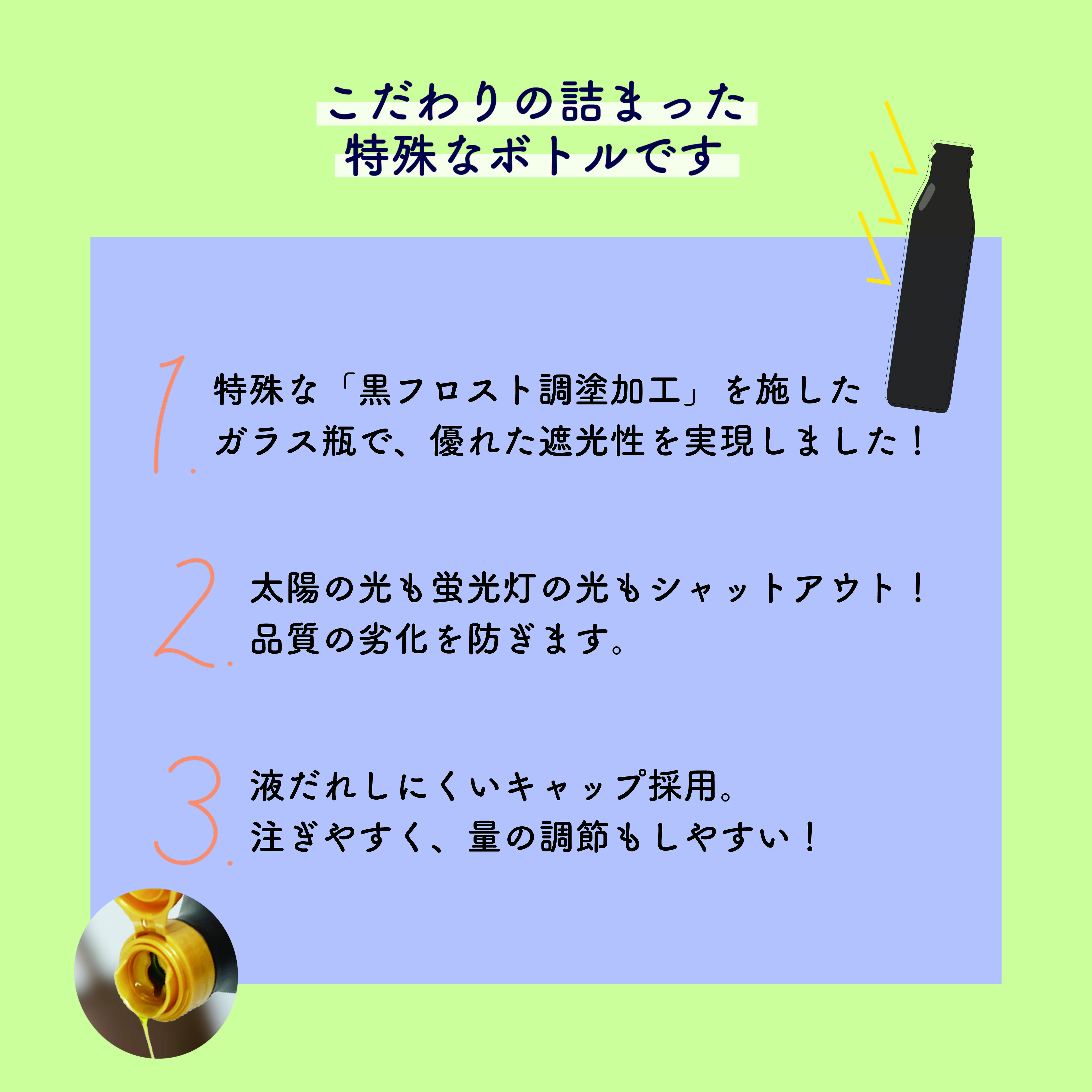 栄養成分の80%が必須脂肪酸。オメガ3とオメガ6を理想的な1:3のバランスで含有しています。コレステロール・トランス脂肪酸はフリー。コクがあって濃厚、だけど軽い口当たりはフレッシュな麻の実油だからこそ。そのまま食べてもいいですし、野菜やお味噌汁などにかけても◎。意外とどんな料理にも合います。瓶は遮光瓶を採用。品質の劣化を防ぎます。