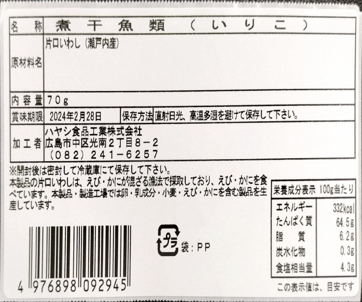 | 栄養成分 | 100g(当たり)/エネルギー 322kcal/タンパク質 64.5g/脂質 6.2g/炭水化物 0.3g/食塩相当量 4.3g |