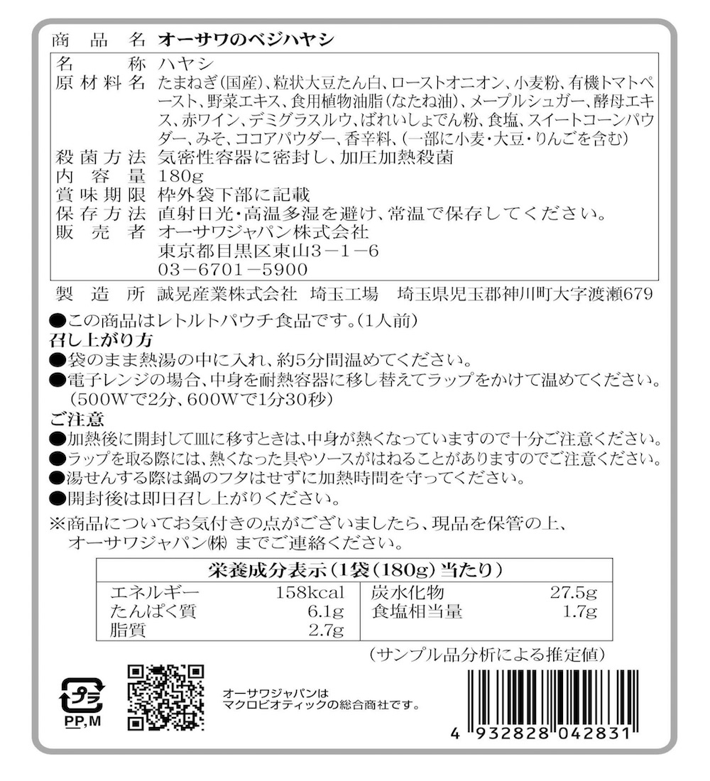 | 原材料名 | 玉ねぎ(国産)、オーサワの国産大豆ミート、ローストオニオン[玉ねぎ(国産)]、小麦粉[小麦(北海道)]、有機トマトペースト[有機トマト(アメリカ)]、野菜エキス、なたね油、メープルシュガー、酵母エキス、赤ワイン、オーサワのデミグラスルウ、馬鈴薯でん粉、食塩(海の精)、スイートコーンパウダー[とうもろこし(国産)]、有機立科豆みそ、ココアパウダー、こしょう、ナツメッグ、セロリーシード、オレガノ |