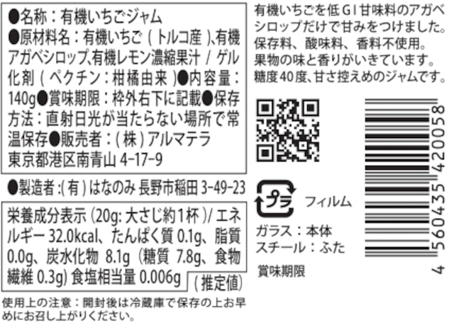 | 原材料名 | 有機いちご(トルコ)、有機アガベシロップ(メキシコ)、有機レモン濃縮果汁/ゲル化剤(ペクチン:柑橘由来) |