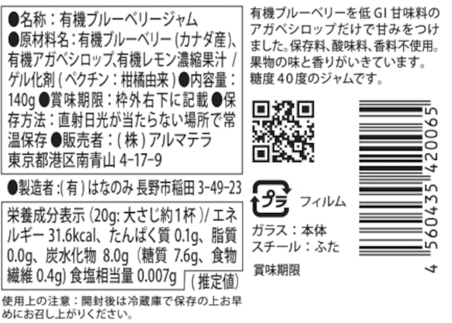 | 原材料名 | 有機ブルーベリー(カナダ)、有機アガベシロップ(メキシコ)、有機レモン濃縮果汁/ゲル化剤(ペクチン:柑橘由来) |