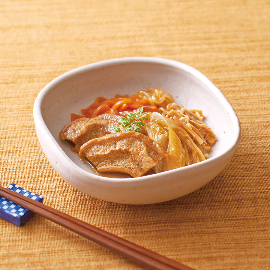 | 原材料名 | 長ねぎ・えのき茸・にんじん・しらたき・オーサワの車麩(国産)、米飴、醗酵調味料、醤油、なたね油、酵 母エキス、食塩(海の精)、水酸化カルシウム(しらたき用凝固剤) |