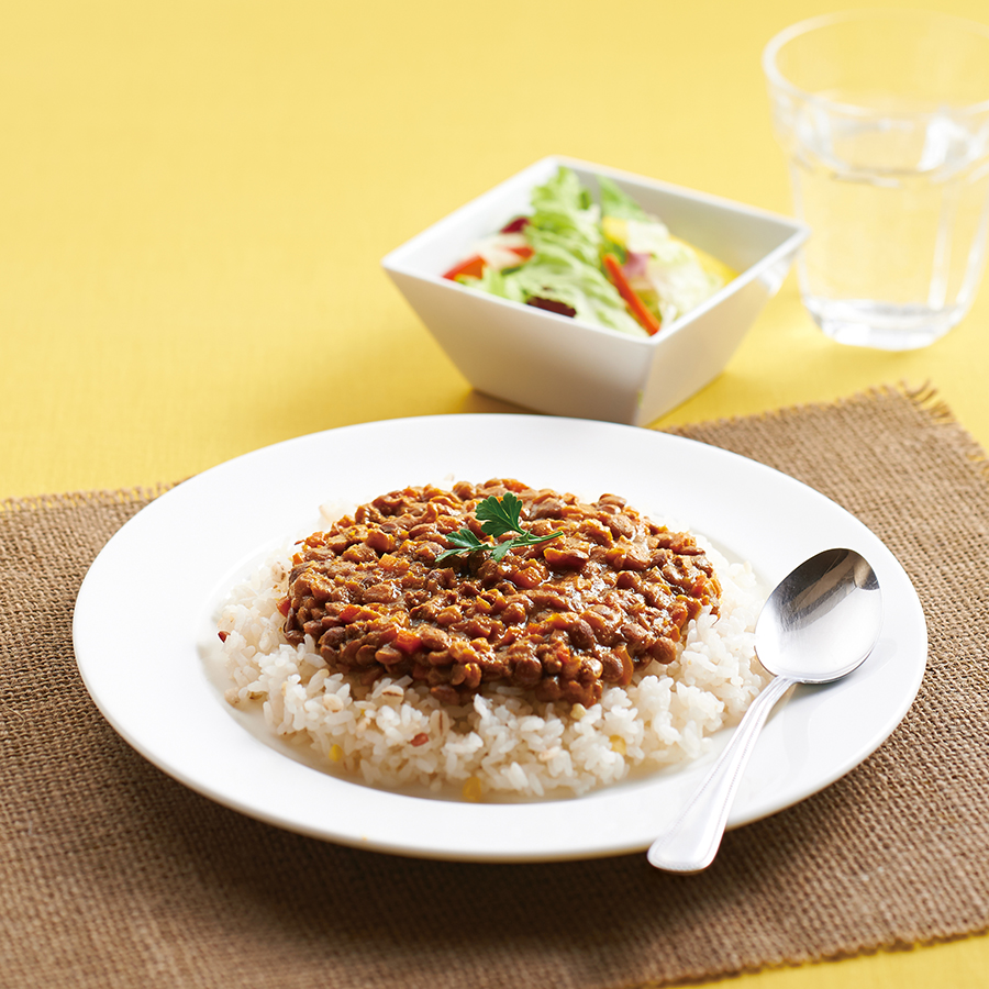 ■「オーサワの国産大豆ミート(ひき肉風)」を加え、キーマカレー風に仕上げた
