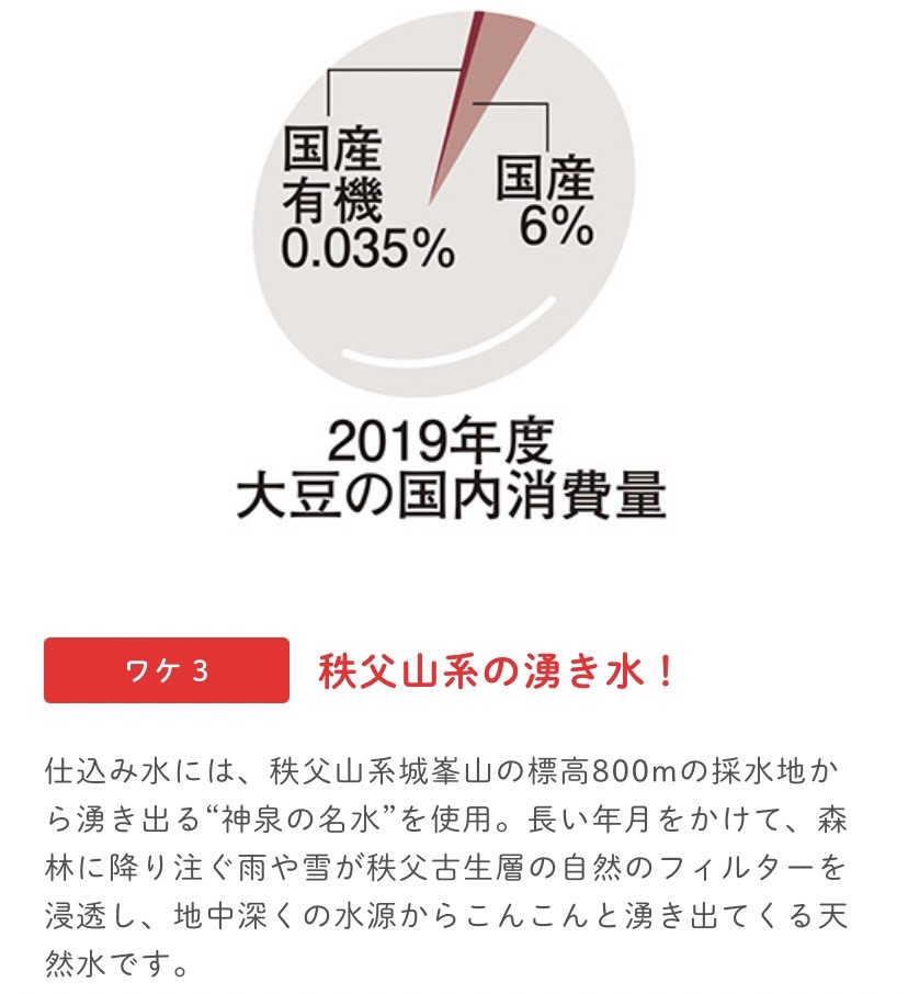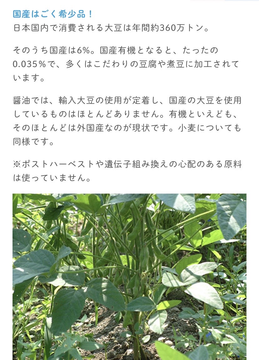 | 原材料名 | 有機大豆(青森・北海道・熊本県)、有機小麦(埼玉・青森県)、食塩(海の精) |