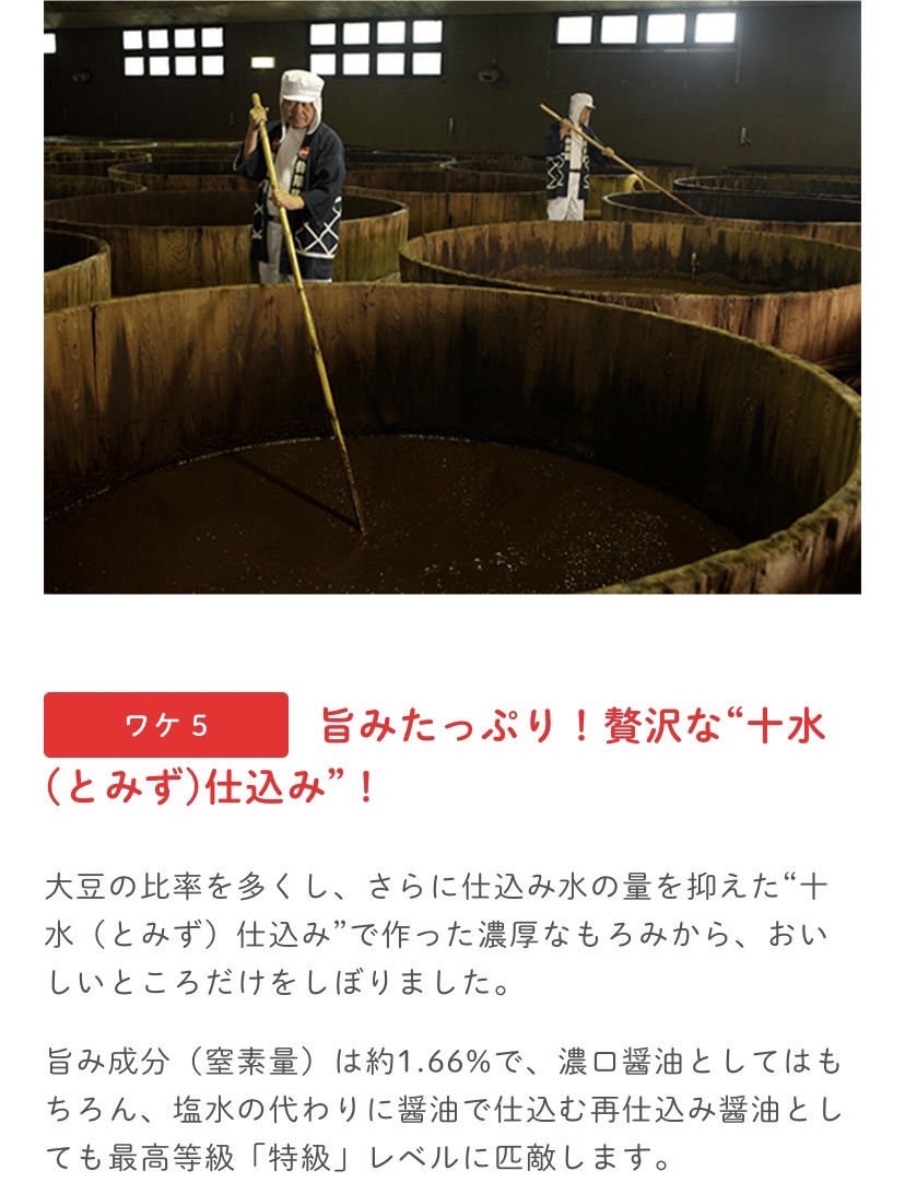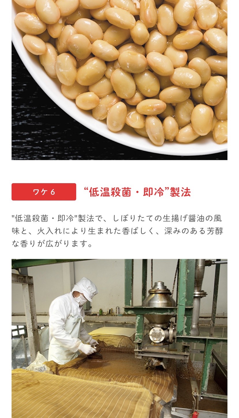*生(き)醤油とは塩以外に何も添加していない醤油のことです。ごく貴重な有機JASの国産大豆と国産小麦、秩父の城峰山頂付近からわく天然水、そして伝統海塩「海の精」でつくりました。杉桶で仕込み、天然醸造法で1年以上、じっくり発酵熟成させています。塩水割りはしていない純醤油です。醤油としても有機JAS認証を取得しています。大豆の比率を多くし、さらに仕込み水の量を抑えた“十水(とみず)仕込み”で作った濃厚なもろみから、おいしいところだけをしぼった旨みのある贅沢な醤油です。また、“低温殺菌・即冷”製法で、しぼりたての生揚げ醤油の風味と、火入れにより生まれた香ばしく、深みのある芳醇な香りが広がります。もっとも広く使われている濃口醤油で、どんな料理にもお使いいただけます。ごく貴重な国産有機の大豆や小麦を原料に、伝統海塩「海の精」が醸し出した旨味と甘味とコクが、いろんな料理をおいしく仕上げてくれます。
