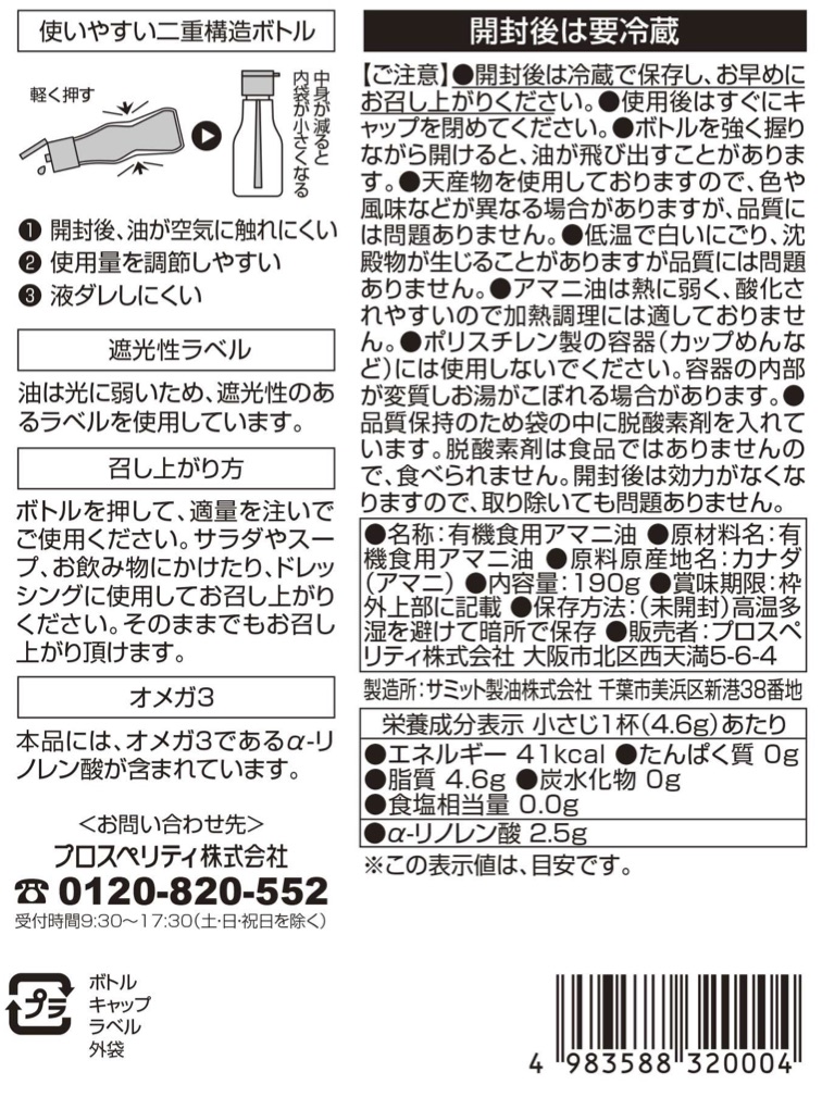 | 名称 | 有機アマニ油(二重構造ボトル) |