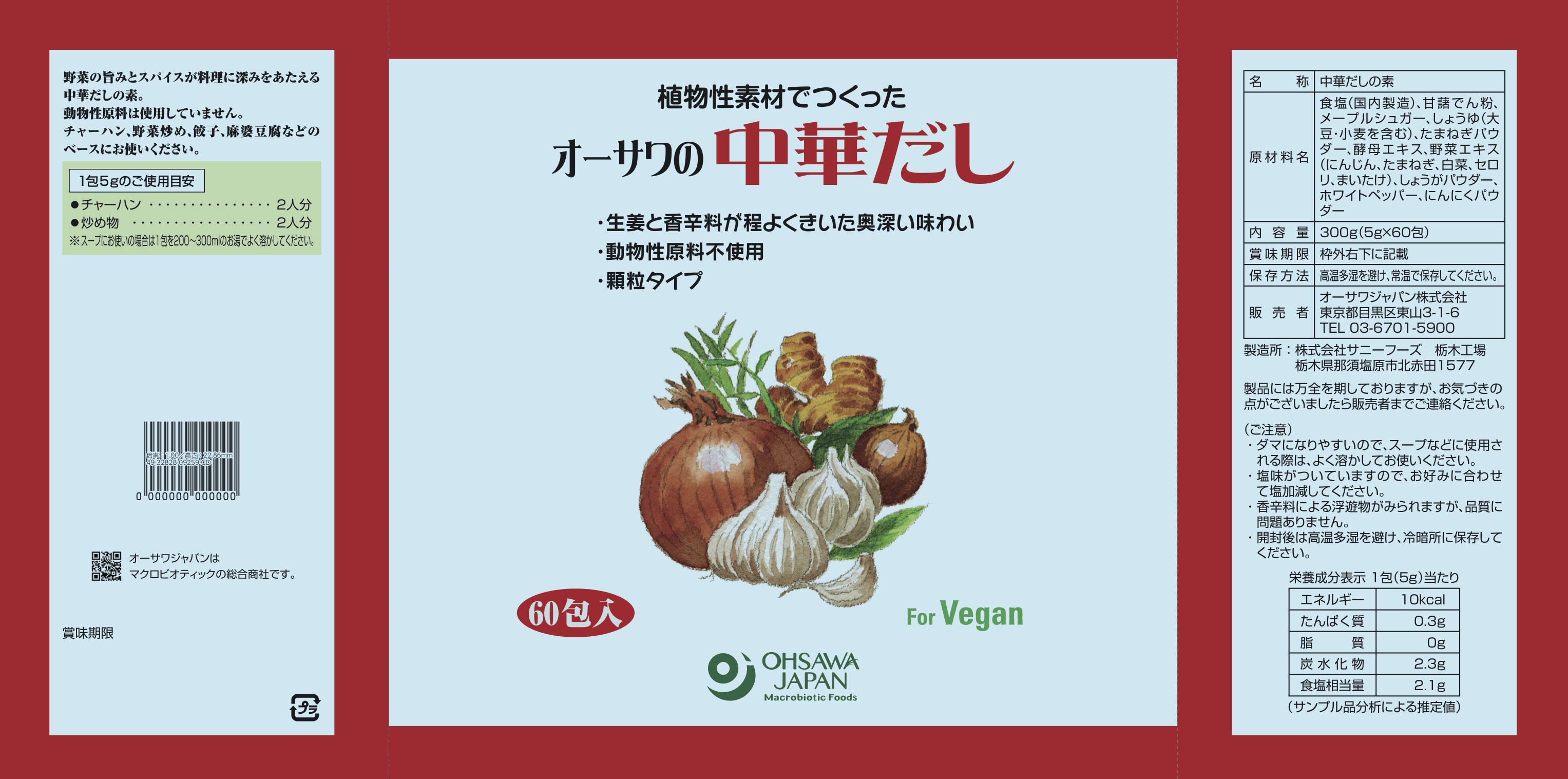 | 原材料名 | 食塩(天塩)、米でん粉[米(国産)]、メープルシュガー、醤油、玉ねぎ(国産)、酵母エキス、野菜エキス[にんじん・玉ねぎ・白菜・セロリ・舞茸(国産)]、生姜パウダー[生姜(国産)]、こしょう(マレーシア、インドネシア)、にんにくパウダー[にんにく(アメリカ)] |