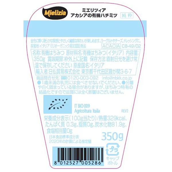 | 名称 | ミエリツィア アカシアの有機ハチミツ(スクイーザーボトル) |