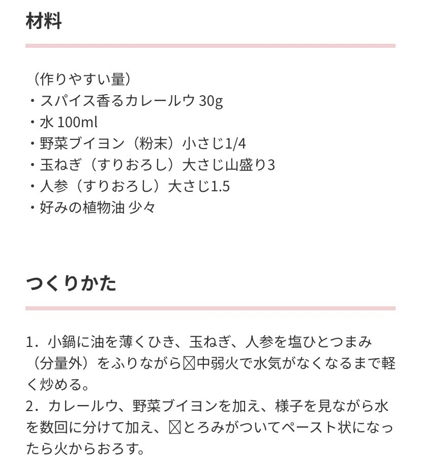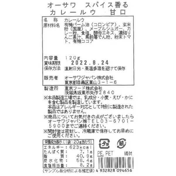 | 原材料名 | 有機パーム油(コロンビア)、玄米粉(山形・宮城・秋田県)、メープルシュガー、カレー粉、食塩(天日塩)、酵母エキス、濃縮りんご果汁、馬鈴薯でん粉[じゃがいも(北海道)]、粉末トマト、有機ココア |