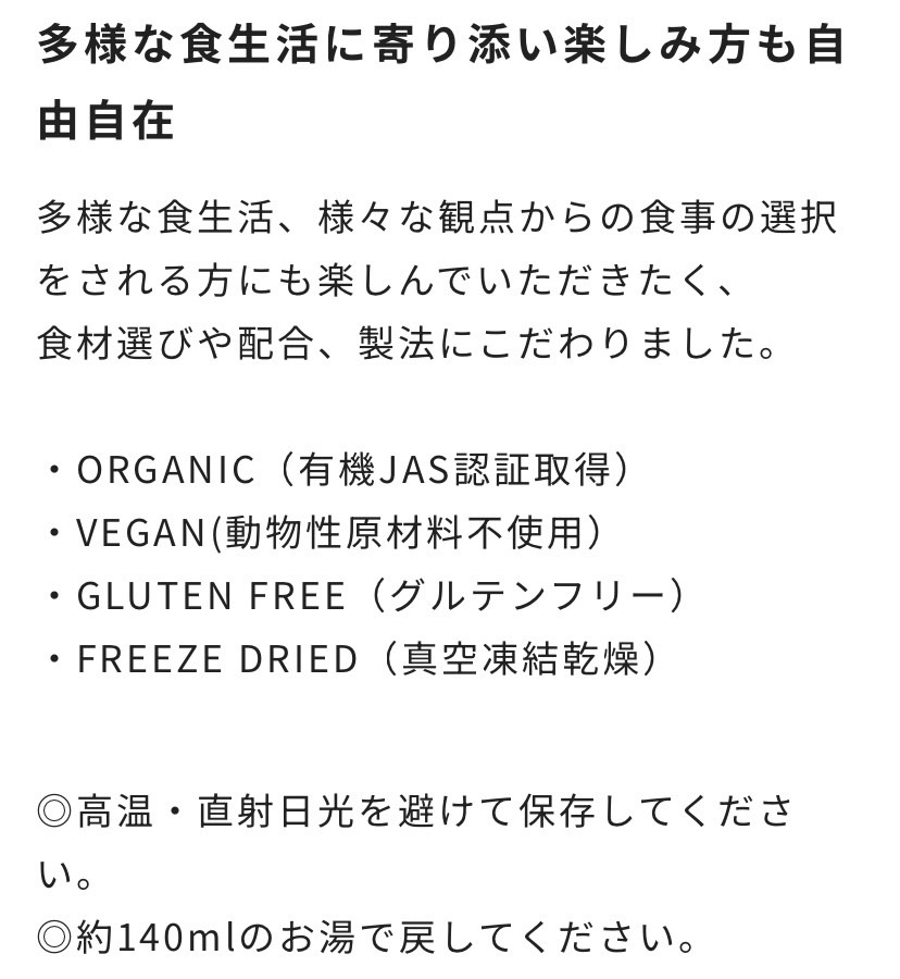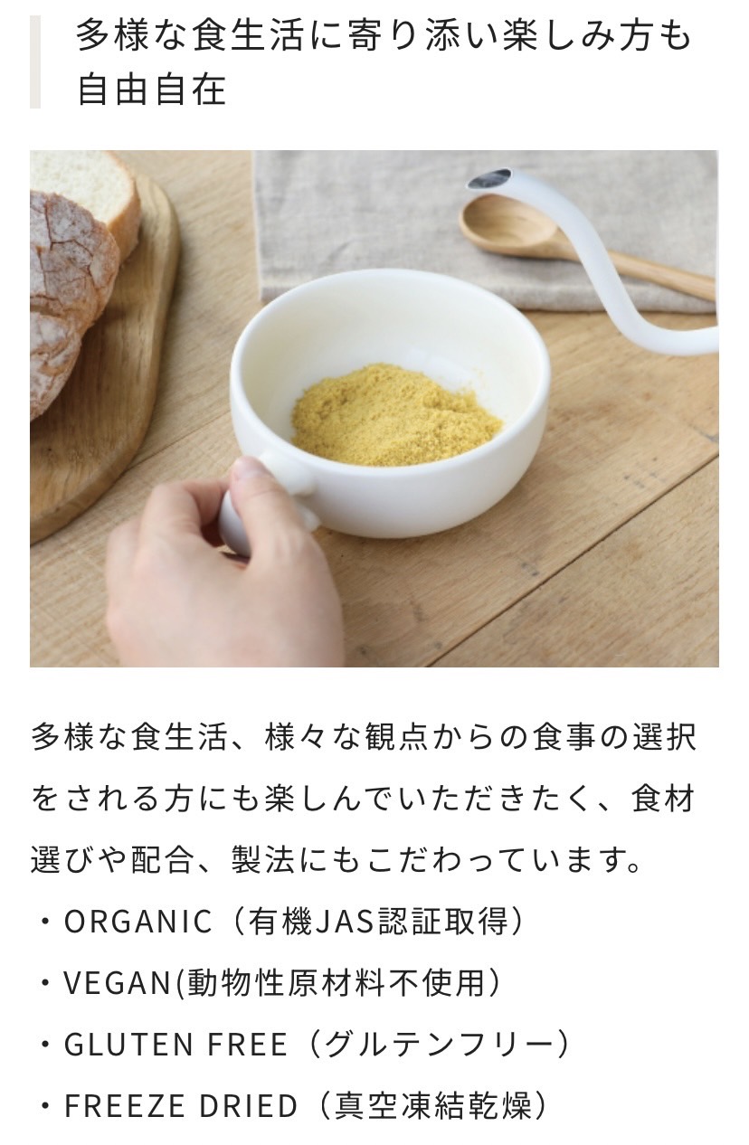 | 原材料名 | 有機カーネルコーン[有機とうもろこし(アメリカ、ハンガリー)]、有機豆乳、有機黒糖、食塩(クリスマス島の塩)、有機ポテトフレーク、有機でん粉[有機じゃがいも(国産)、有機キャッサバ(タイ)]、白こしょう、有機発酵野菜粉末[発酵ねぎ(タイ)、発酵人参(タイ)] |