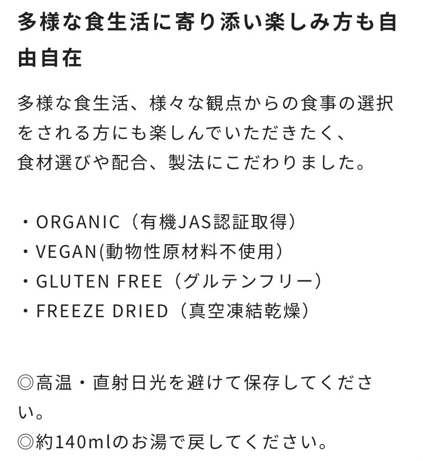 | 原材料名 | 有機トマトペースト[有機トマト(アメリカ)]、有機豆乳、有機にんじんペースト[有機にんじん(国産)]、有機カーネルコーン[有機とうもろこし(アメリカ)]、有機黒糖、有機ポテトフレーク、食塩(クリスマス島の塩)、白こしょう、有機発酵野菜粉末[発酵ねぎ(タイ)、発酵人参(タイ)]、有機でん粉[有機じゃがいも(国産)、有機キャッサバ(タイ)] |