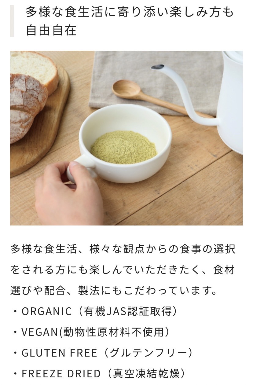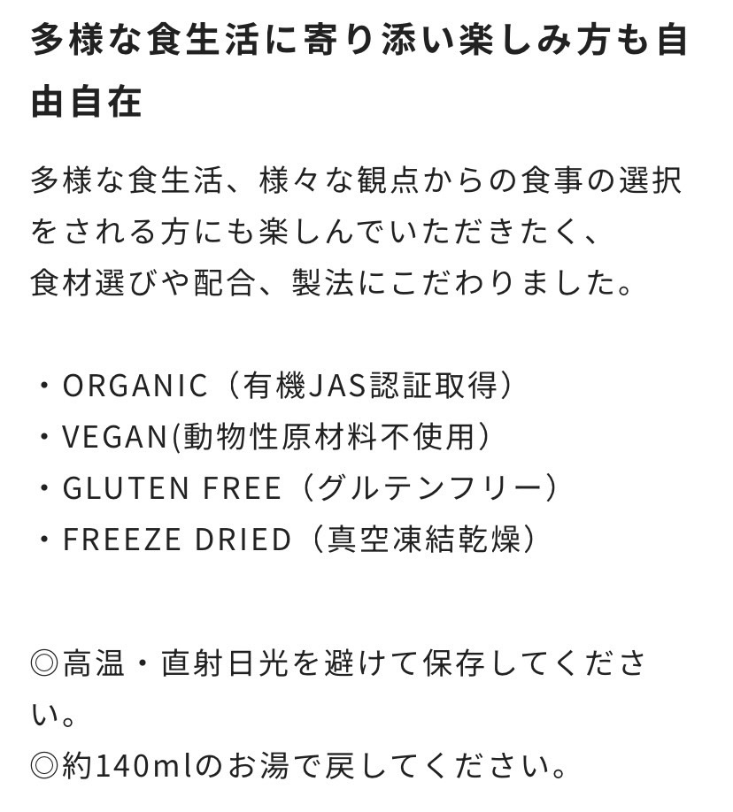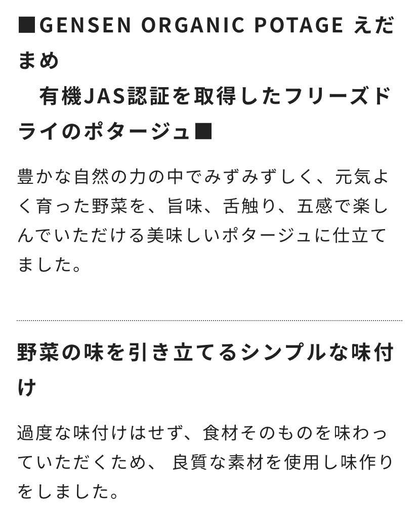 | 原材料名 | 有機むきえだまめ[有機枝豆(中国)]、有機豆乳、有機黒糖、有機でん粉[有機じゃがいも(国産)、有機キャッサバ(タイ)]、食塩(クリスマス島の塩)、有機ポテトフレーク、白こしょう、有機発酵野菜粉末[発酵ねぎ(タイ)、発酵人参(タイ)] |