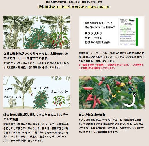 アフリカの真珠と称されるウガンダから、フェアトレードで大切に育てられた「ほんもの」の自然栽培コーヒーをご提供します。ウガンダの恵まれた気候と土壌が生み出す豊かなコクと香りをぜひお楽しみください。完熟したコーヒーチェリーだけを選びひとつひとつ手摘みした最高規格のコーヒーです。