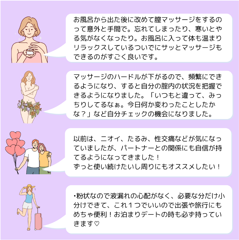 フェムゾーンの他、首、デコルテ、バスト、ヒップ、お顔など、潤いふっくらさせたいところにもおすすめです
