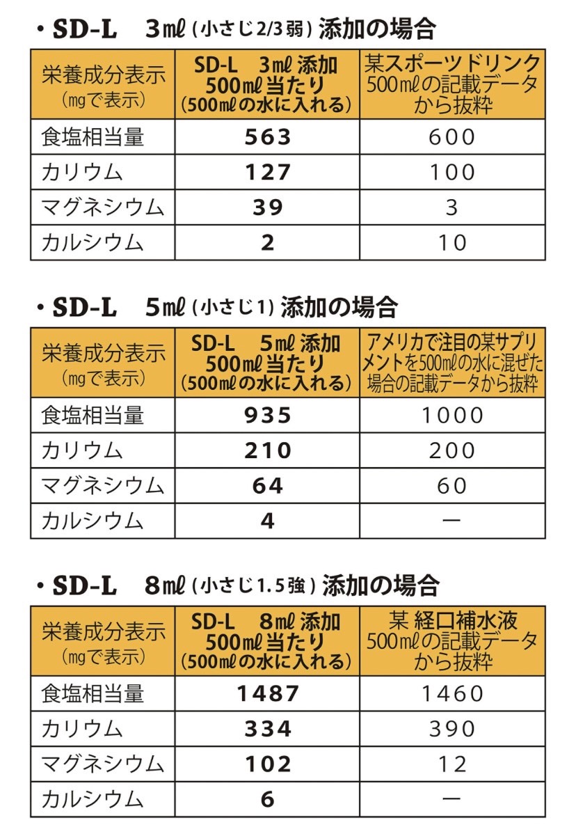 | 栄養成分 | 100ml(当たり)/エネルギー 0kcal/タンパク質 0g/脂質 0g/炭水化物 0g/食物繊維 0g/食塩相当量 18.9g/カリウム4,248mg/マグネシウム1,298mg/塩化物イオン18,479mg |