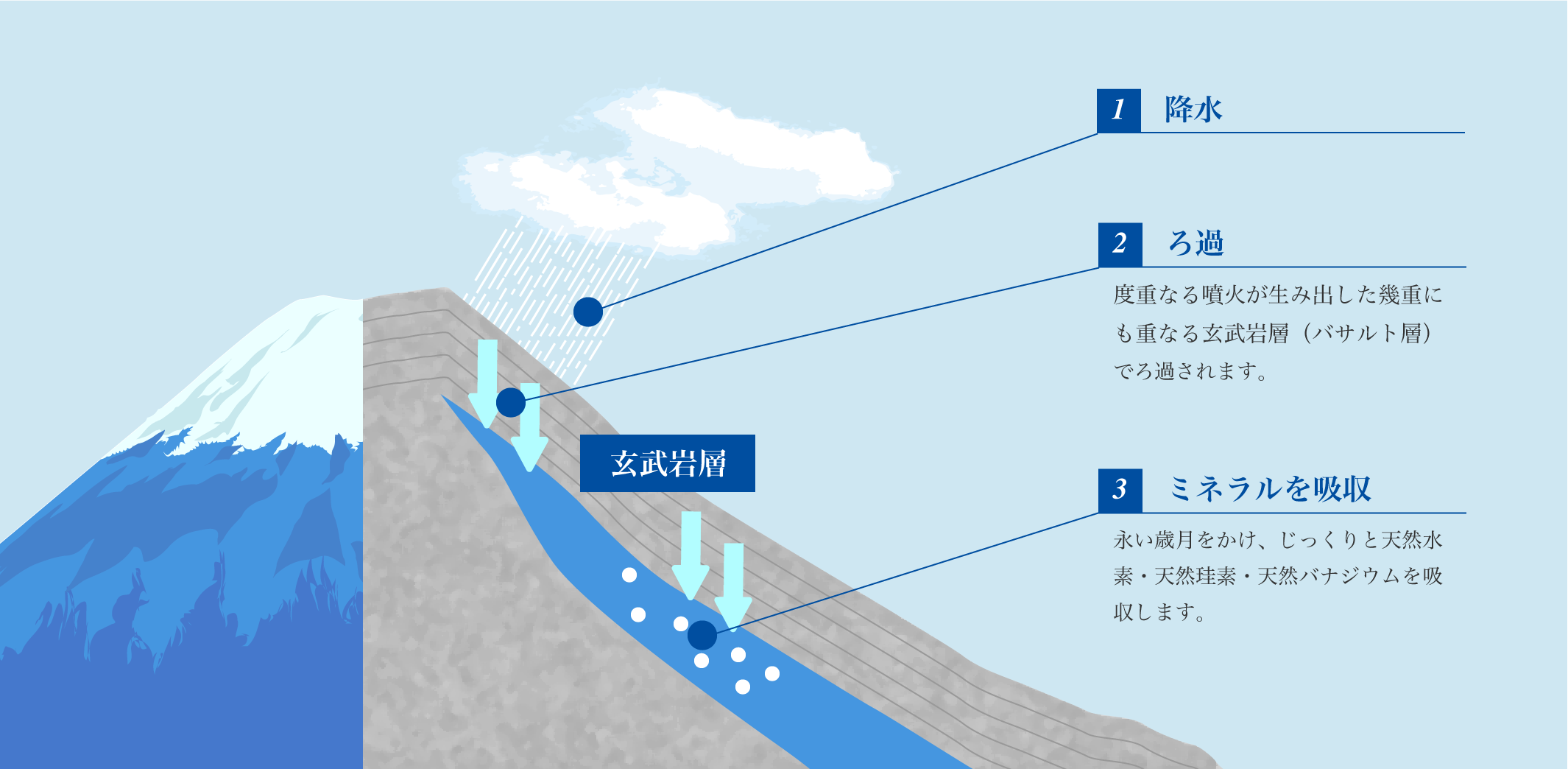 雄大な富士に降り注いだ雨水や雪が永い歳月をかけて、約1,000mにおよぶその玄武岩層の地中に浸み込み、地底深く伏流水となっていきます。