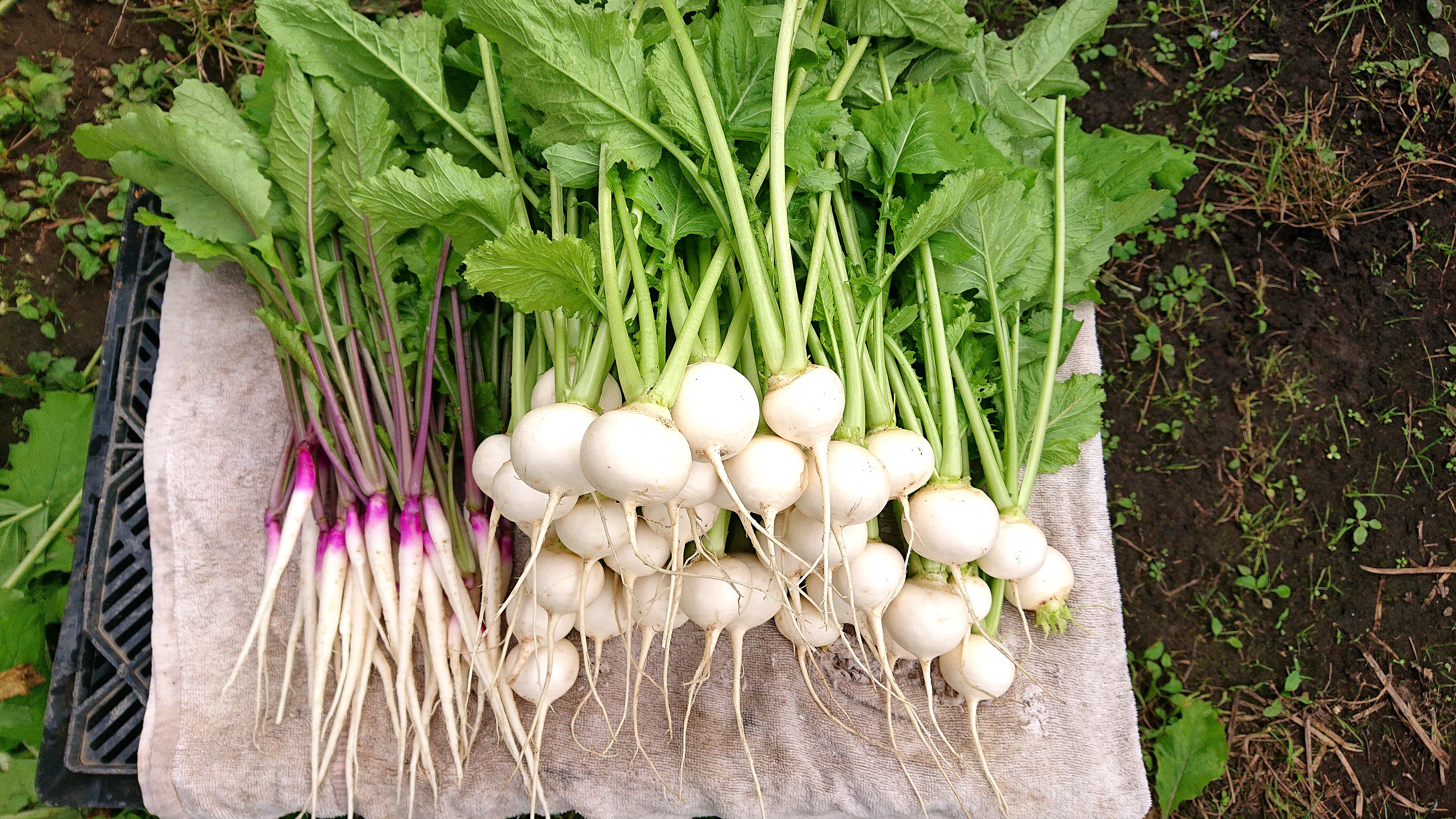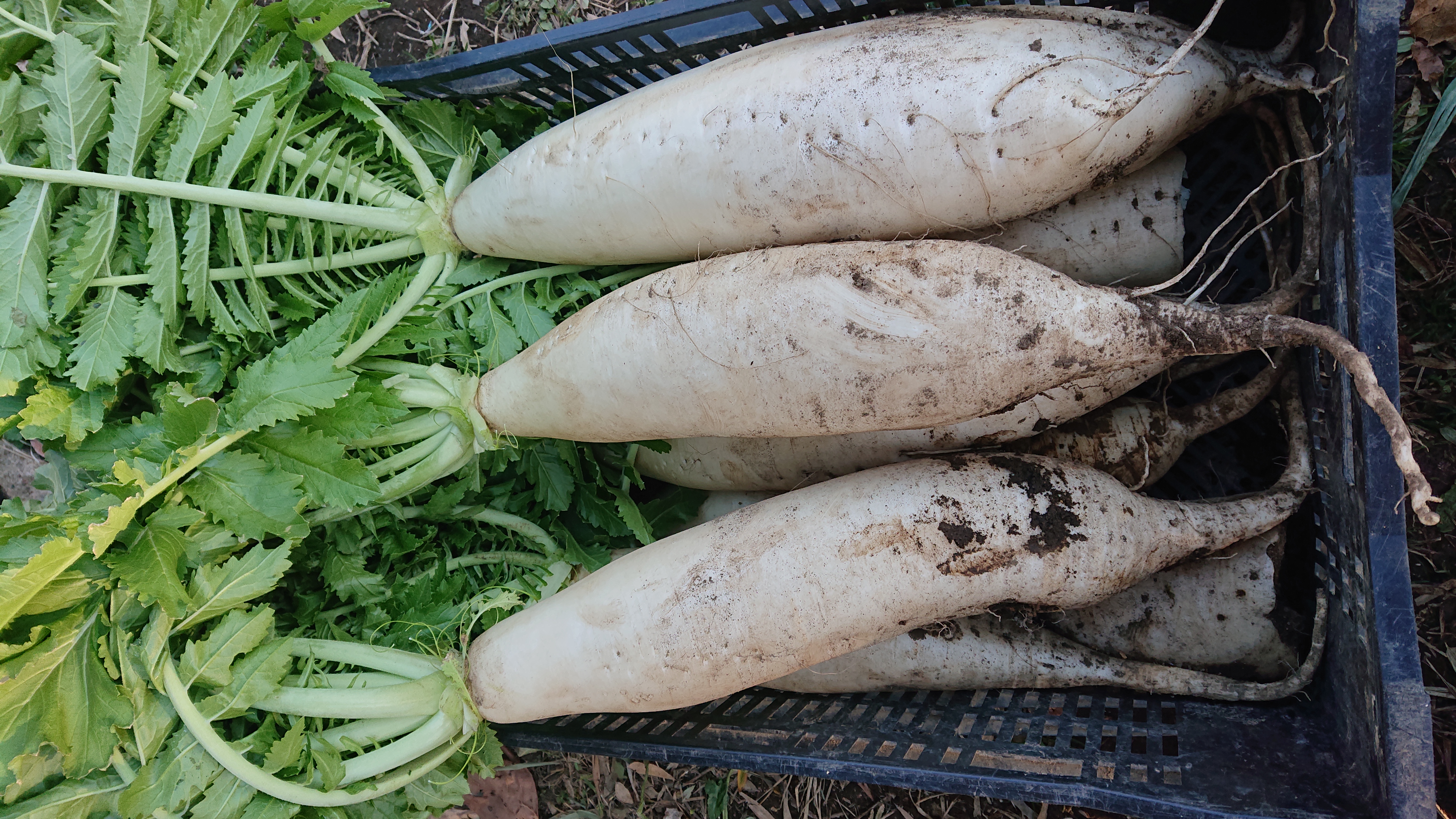 大根、白菜、ブロッコリー、水菜、ターサイ、人参、おふくろ大根、水菜、小松菜