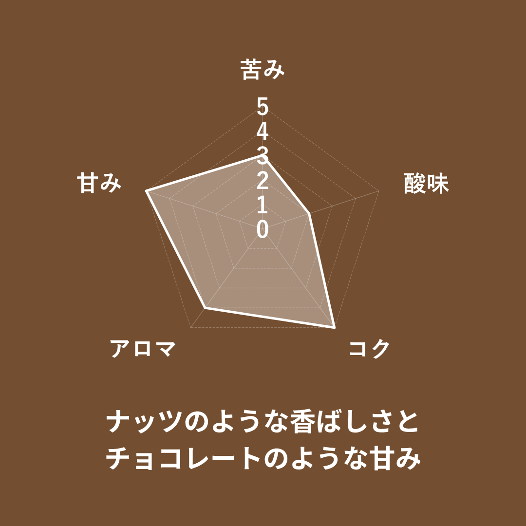 特徴:滑らかな甘みと爽やかな酸味、芳醇でマイルドなコク、バランスの取れた味わいの中に、ナッツ系の余韻