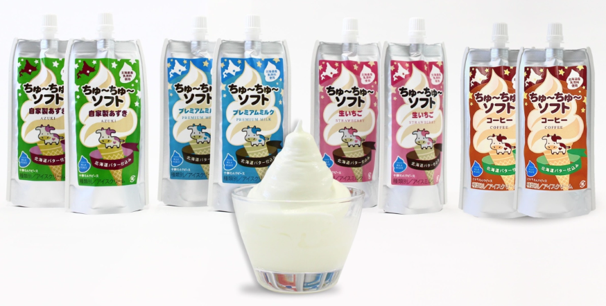 牧場の生乳100%にバターを使用し、天然素材にこだわった濃厚でなめらかなソフトクリームをパウチに詰めました。