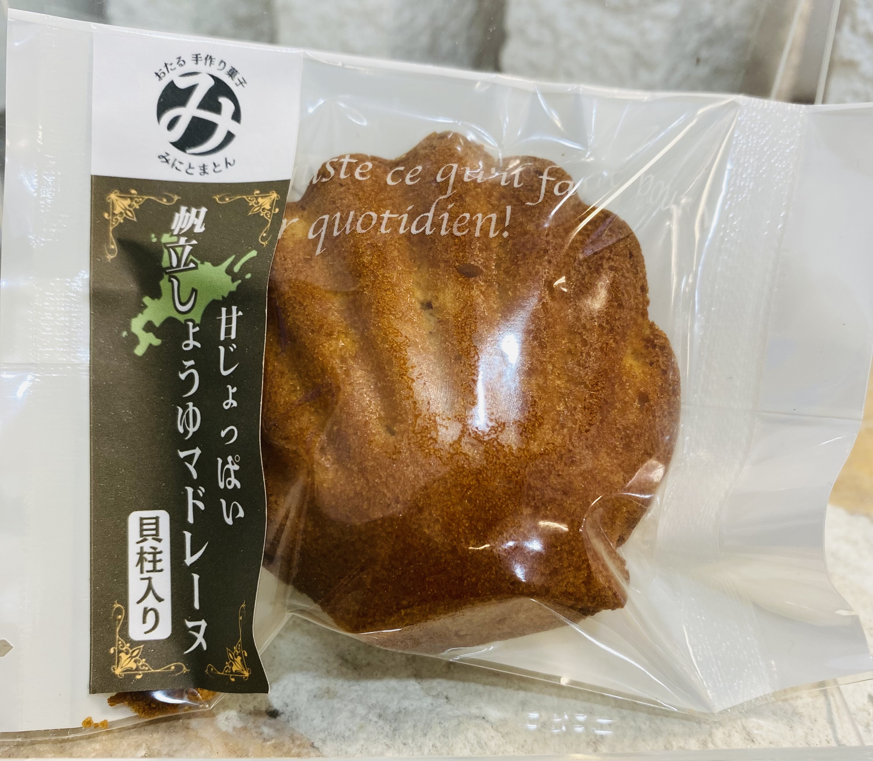 帆立しょうゆマドレーヌは貝柱入りです。ホタテは甘辛の味付けが合うのだからお菓子にしても抜群な組み合わせです。