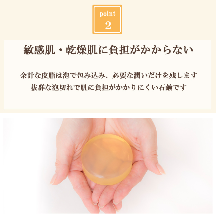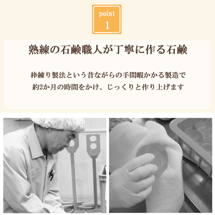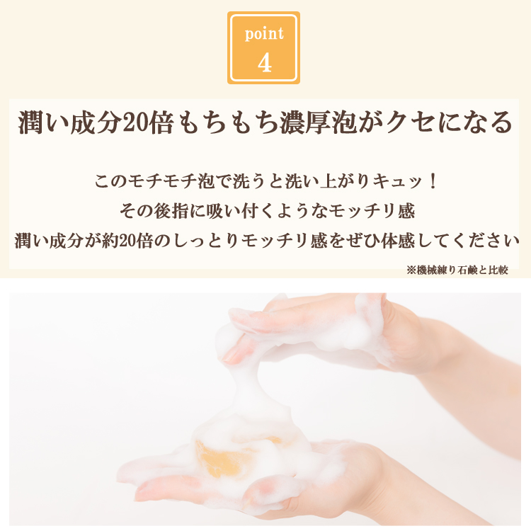 昔ながらの手法を取り入れているので現在主流である「機械練り」石鹸と製法が違い、保湿成分が約20倍も高い石鹸です。