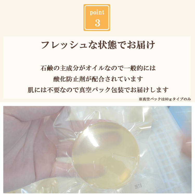 お客様が開封したときにはじめて空気に触れます。(配合のオイルは通常で酸化しにくいものを採用していますが、毎日使うので表面は常にフレッシュな状態となります)