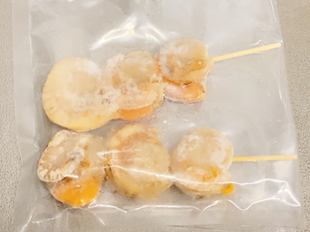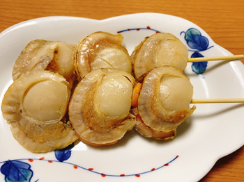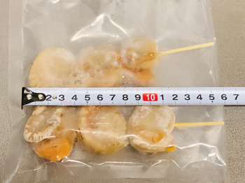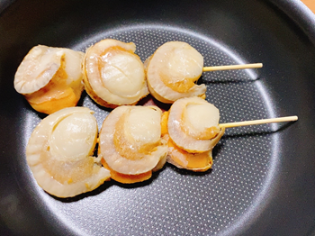 ・ホタテ(2Sサイズ、約3cm)を3コずつ串に刺しました