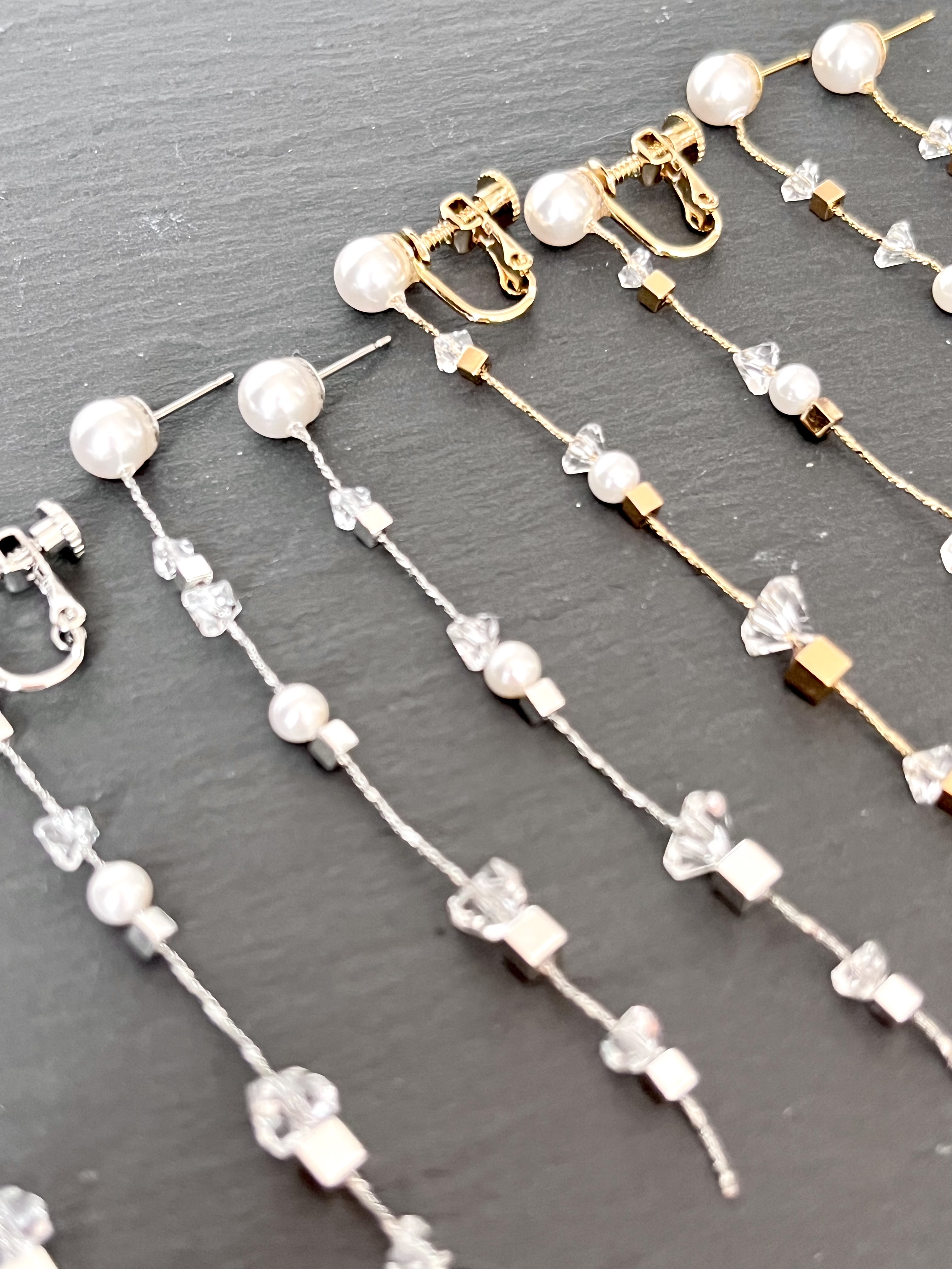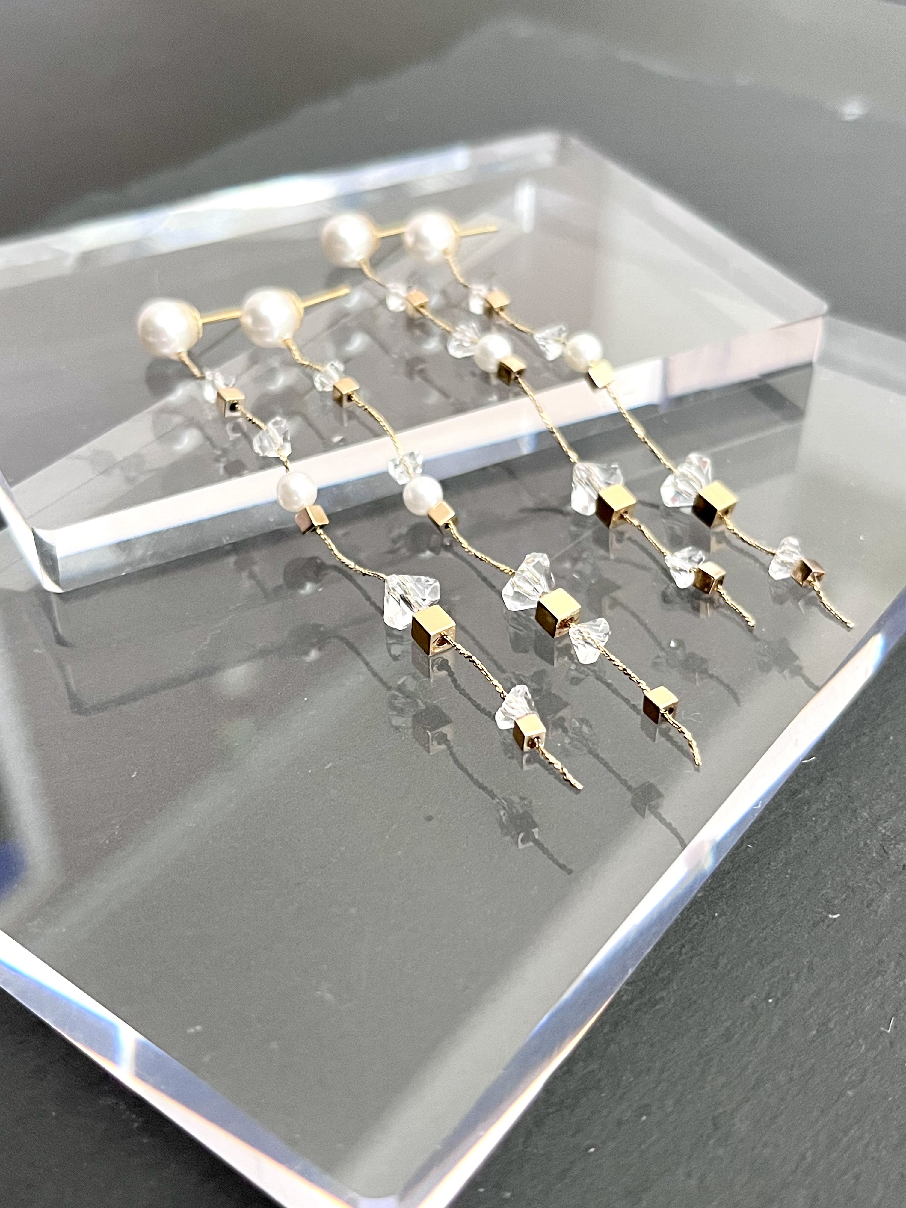 (ロングチェーンにパールとクリアビーズをシンプルに合わせた女性らしい上品なデザイン)