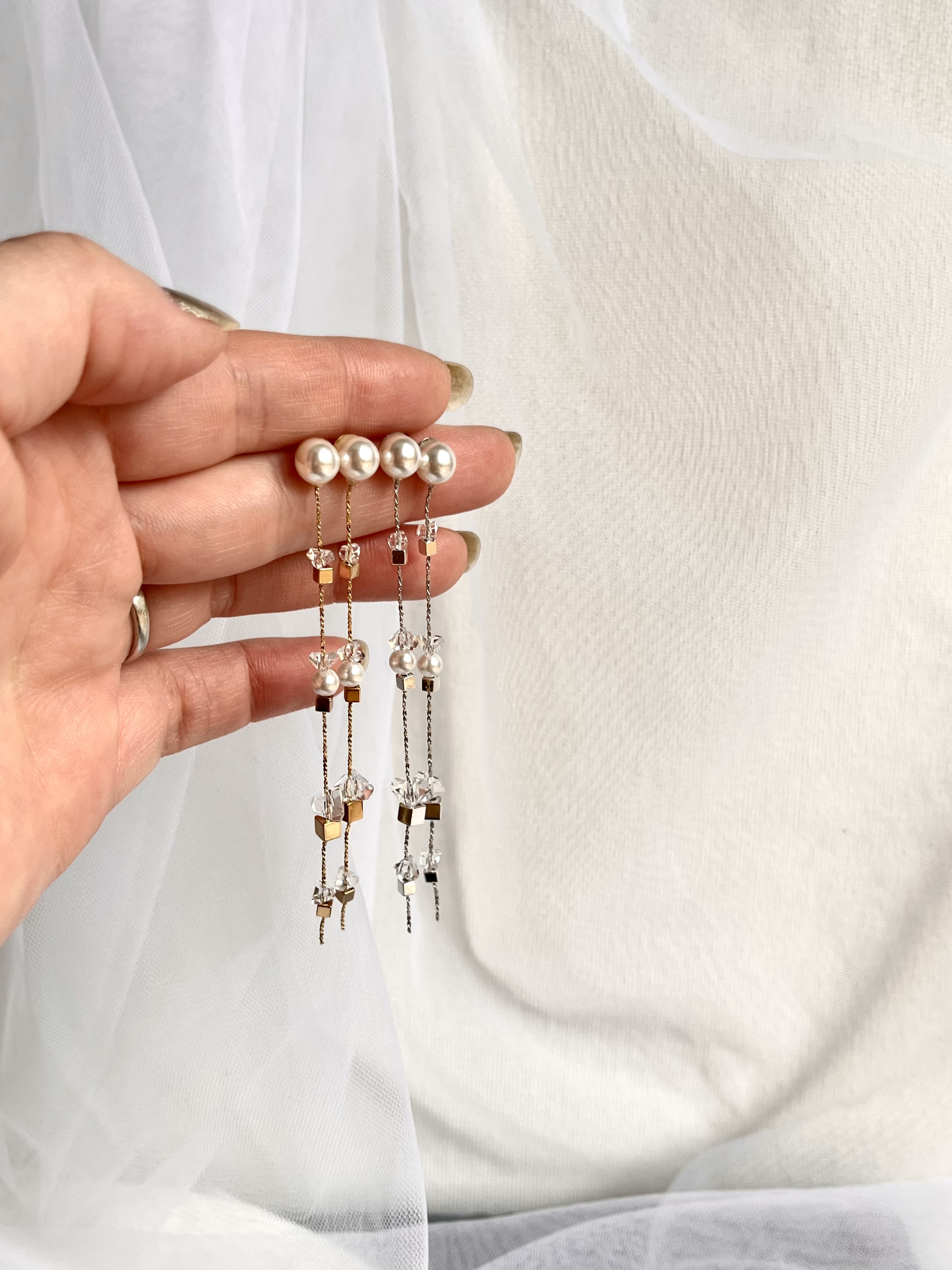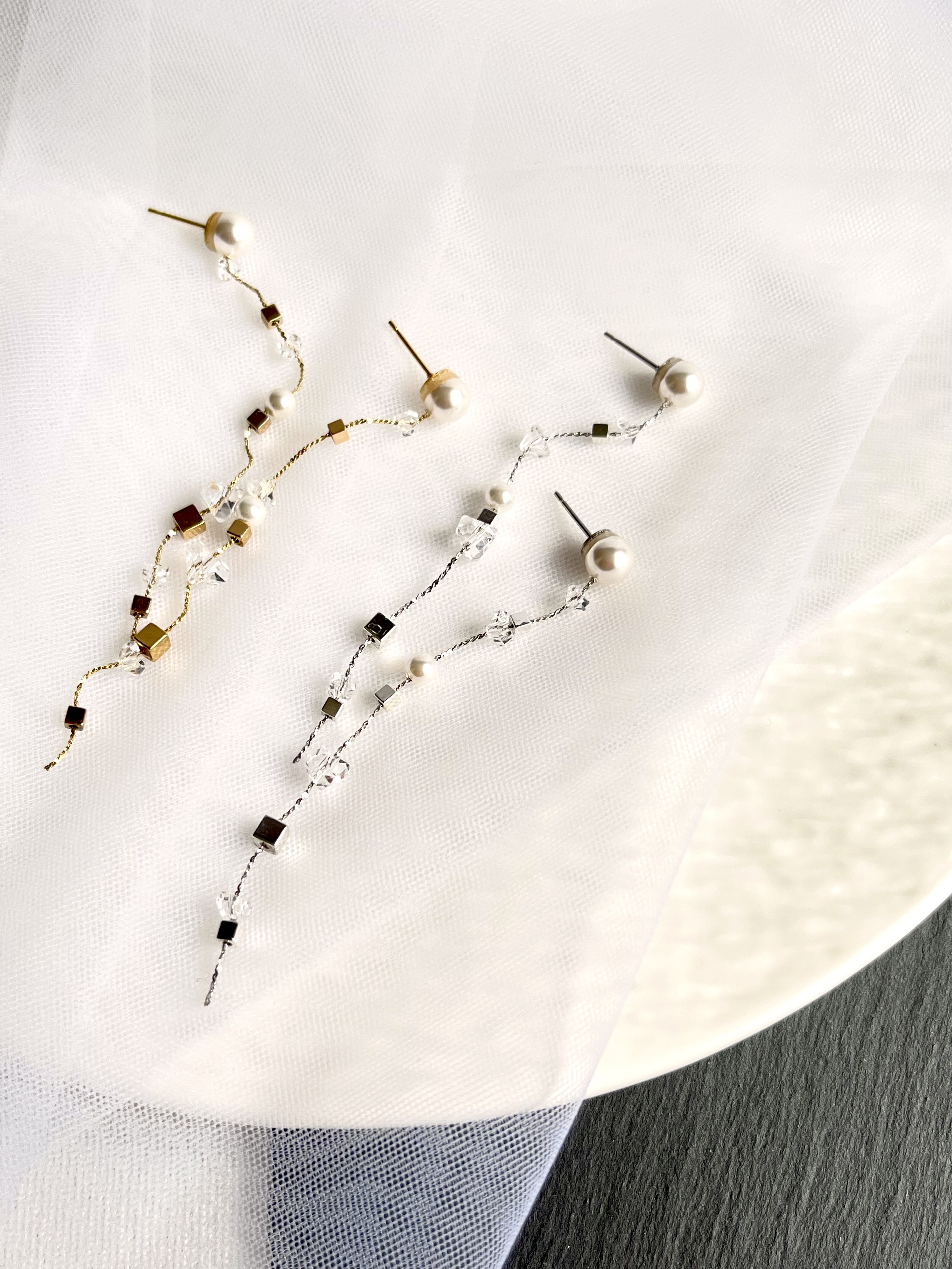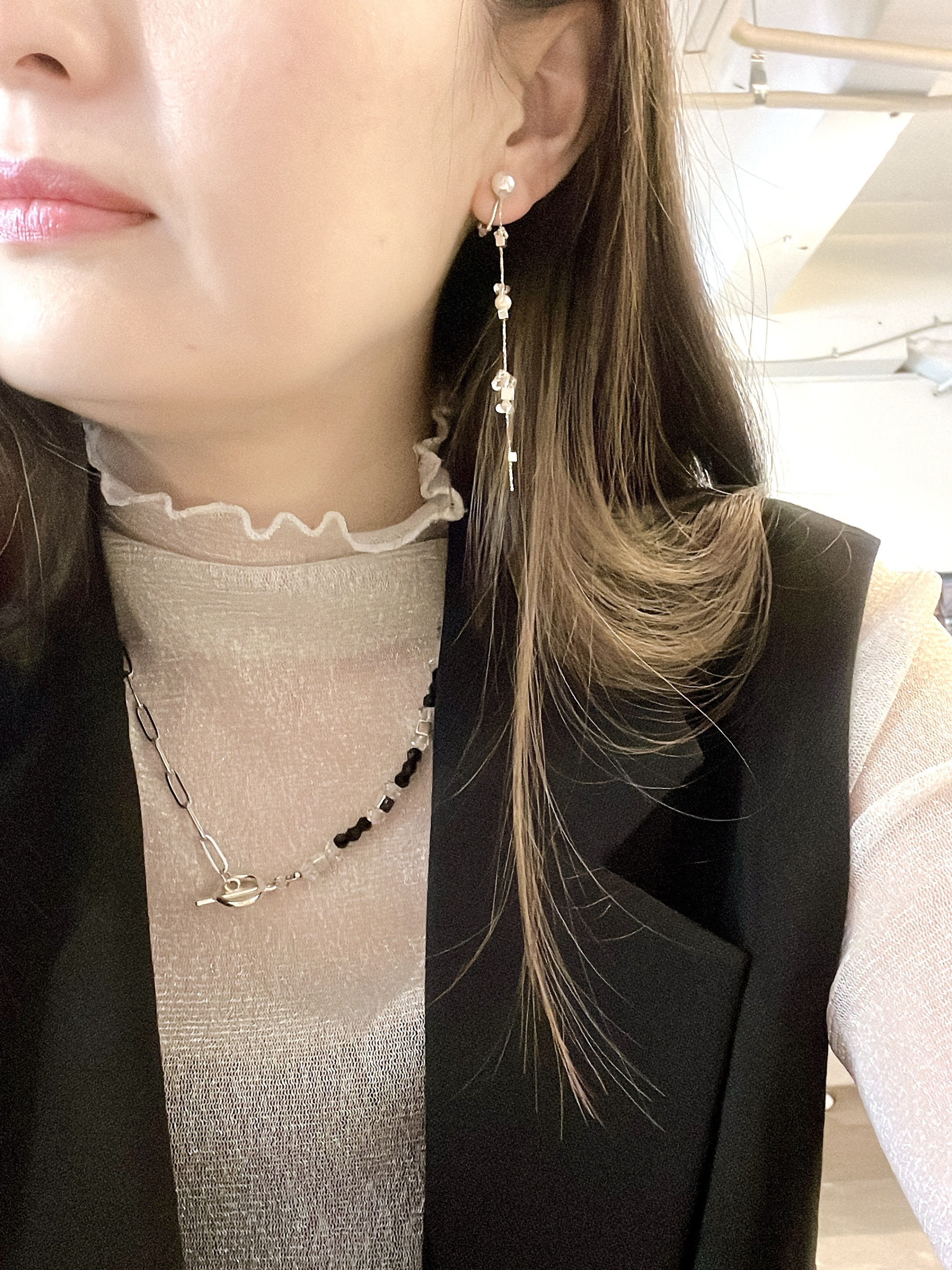 (個性のある淡水パールに極細の華奢チェーンを合わせたデザイン)