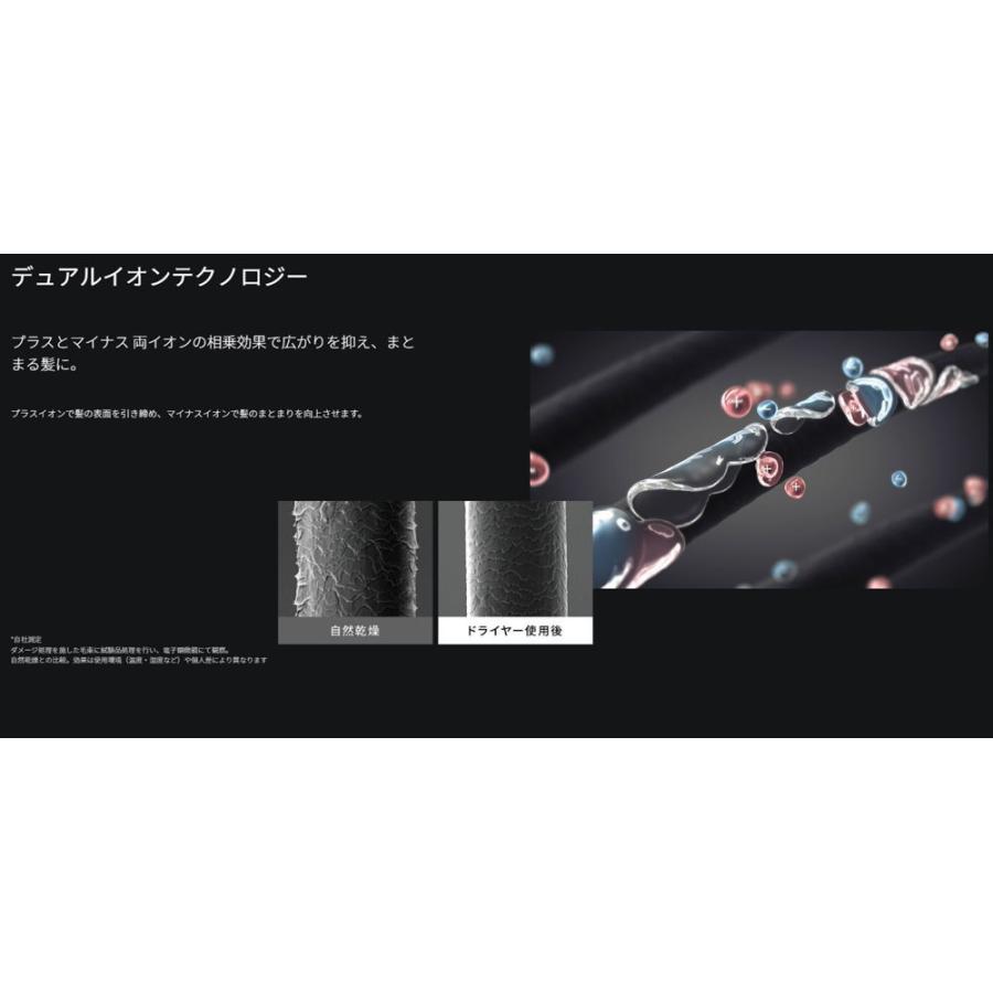 プラスイオンで髪の表面を引き締め、マイナスイオンで髪のまとまりを向上させます。