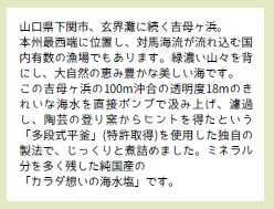この塩は、山口県の美しい海からいただく清らかな海水を、昔ながらの伝統製法「平釜(ひらがま)炊き」で、じっくりと時間をかけて作られます。