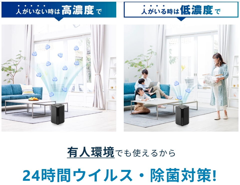 人がいない時は高濃度で、人がいる時は低濃度で、24時間ウィルス・除菌対策!