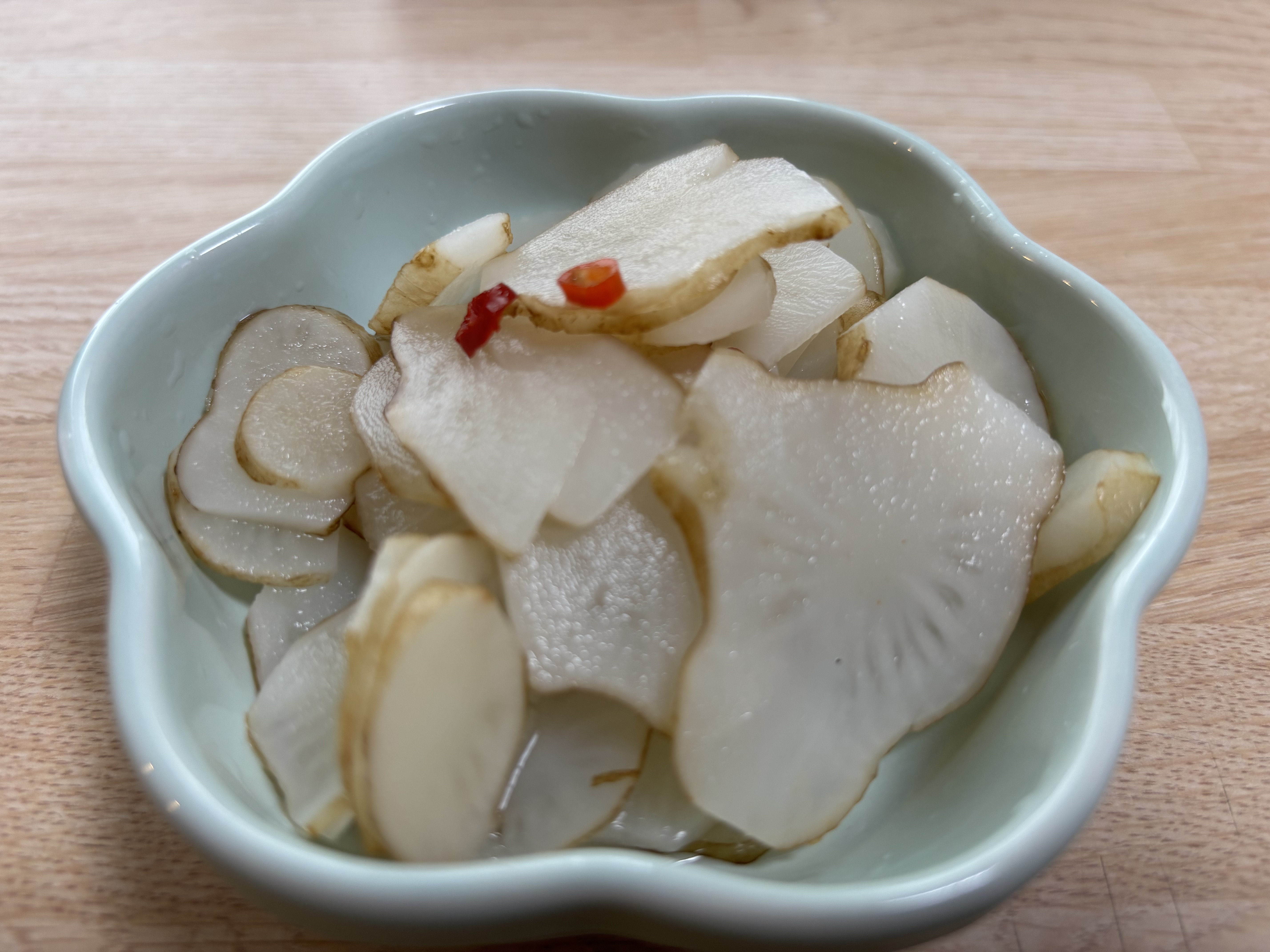 シャキッとした食感と、ほどよい甘酸っぱさがクセになる「きくいも甘酢漬け」。