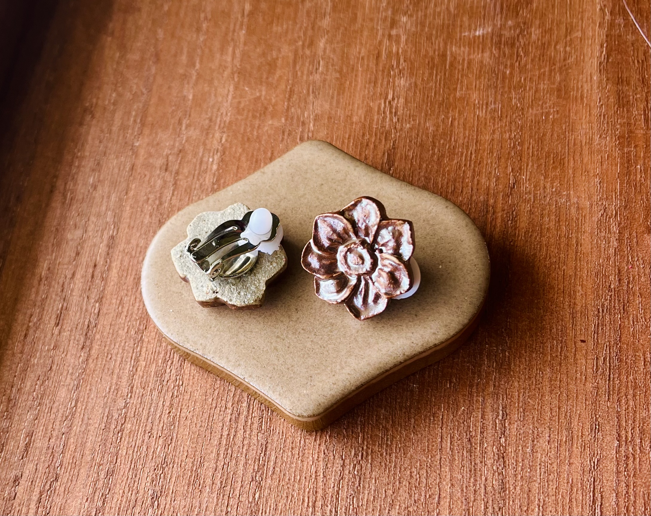 私の住む島根県益田市の花である水仙をモチーフにイヤリングを作りました。落ち着いた中にも華やかさと上品な雰囲気があるイヤリングです。