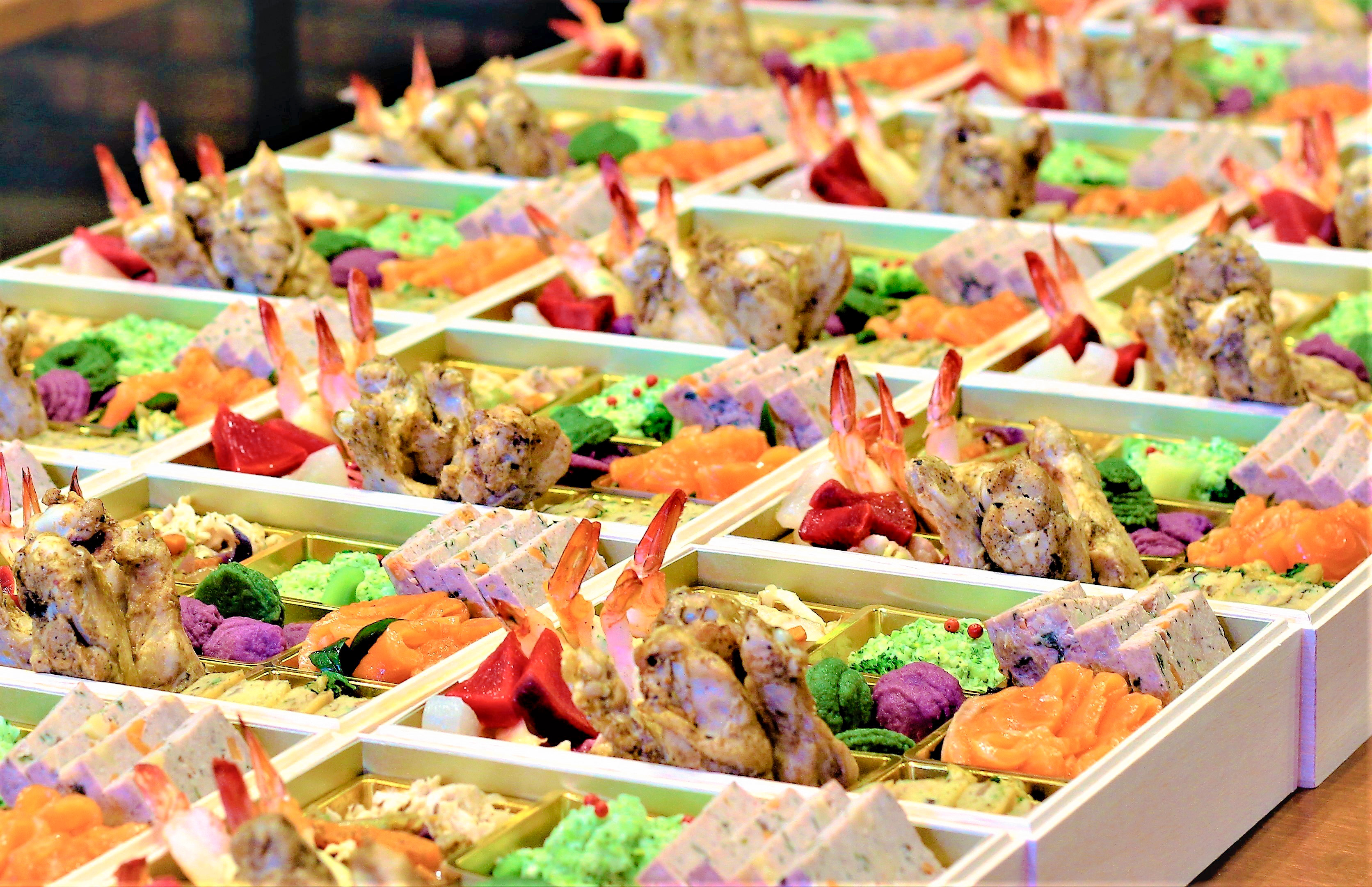 天然エビのパイ包み焼き・牛肉のホロホロ煮込み、豚肉のブレゼ・鶏もも肉のコンフィ・無投薬気鋭島サーモンのマリネ・和牛ローストビーフ