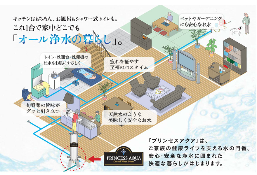 セントラル浄水器とはセントラル浄水器はご自宅の水道の元栓に直接浄水器を設置することで、家中の蛇口から出てくるお水すべてを浄水に出来るシステムです。 これにより塩素やトリハロメタンの他さまざまな不純物が除去されるので、シャワーや洗濯水、家庭菜園やペットのお水も安全なお水を使う事ができるうえ、給水設備の保全・延命にも効果的です!!