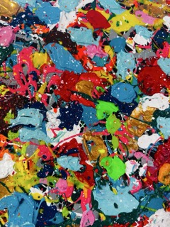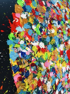 人々の様々な価値観が混ざり合い、飛び散り、離れてくっつき、感情や想念が一つになり、中心には心許ないが絶対的な愛を表現しました。