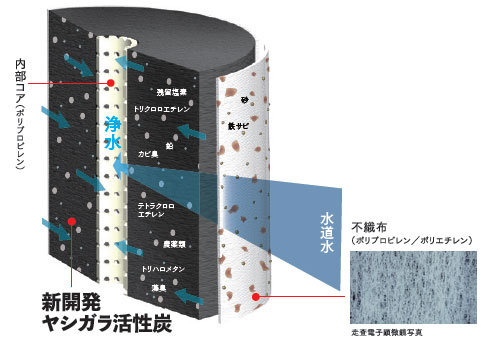 独自技術で開発・配合した活性炭で様々な微粒子の吸着性能を実現。 毎分20リットルの通水性能を継続的に発揮。 |