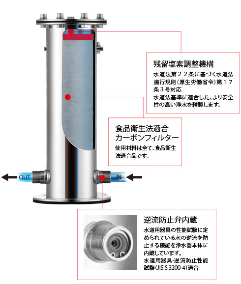 | ヤシガラ活性炭カーボンフィルターを搭載、有機フッ素化合物PFAS(PFOA/PFOS)除去対応。 |