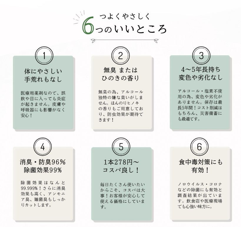次亜塩素酸は効果は強くノロウイルスにも効きますが、その分肌荒れや人体にも影響があります。
