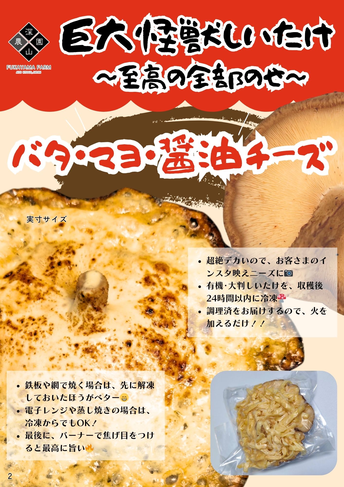 バター・マヨネーズ・醤油・チーズを乗せた大判しいたけ。調理済なので、火を加えるだけ