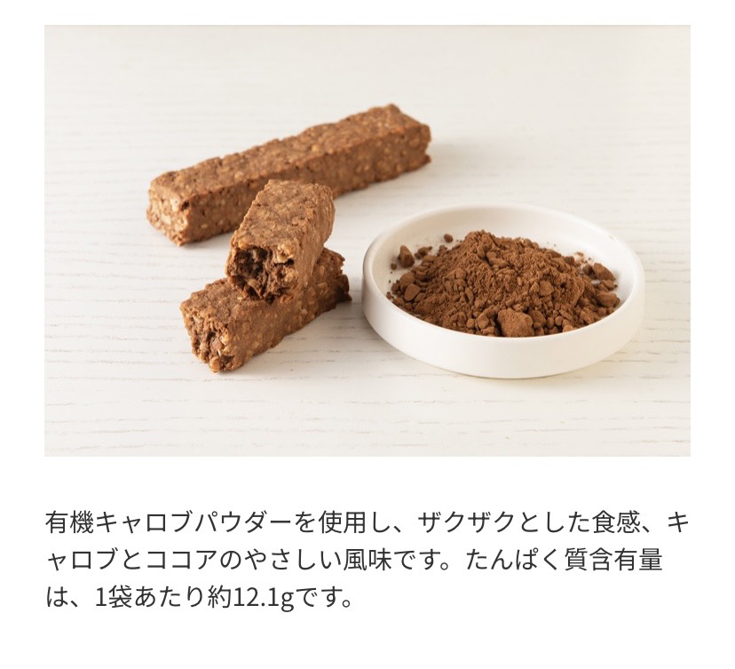 | 原材料名 | 有機オーツ麦(アメリカ)、オーサワの有機メープルシロップ、なたね油、えんどう豆たんぱく[えんどう豆(フランス他)]、有機豆乳、大豆クラッシュ[大豆(国産)]、アーモンド・アーモンドパウダー(アメリカ)、有機キャロブパウダー、ココアパウダー |