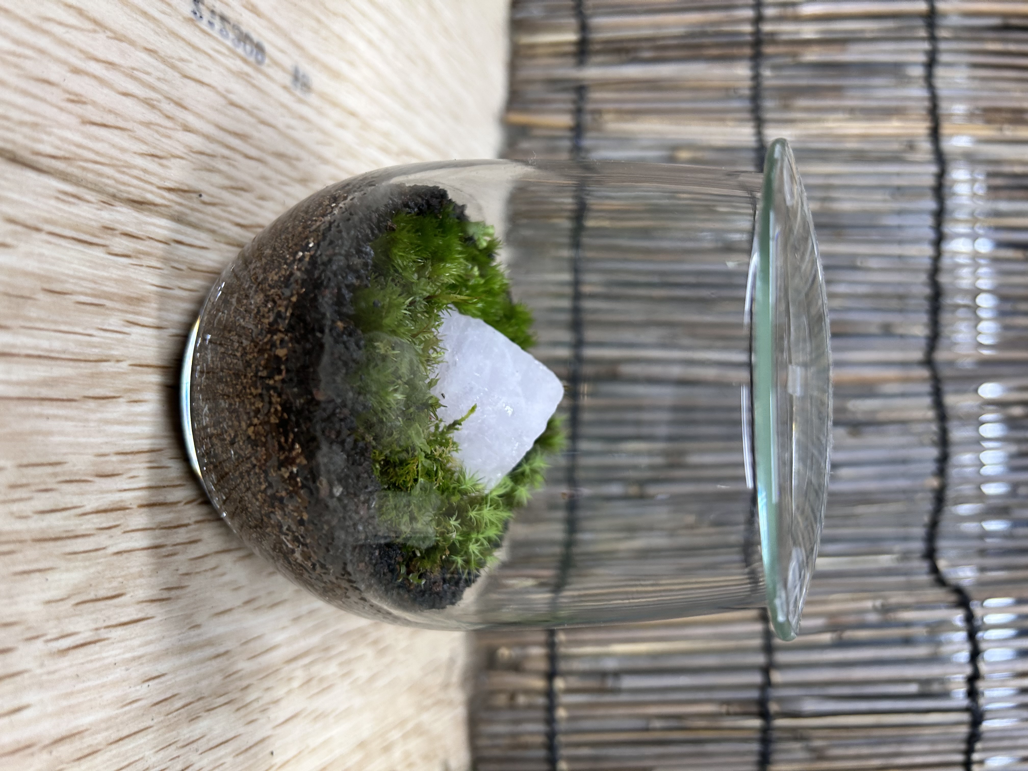 ガラスの容器に苔を植え、中央にはクォーツを入れています。
